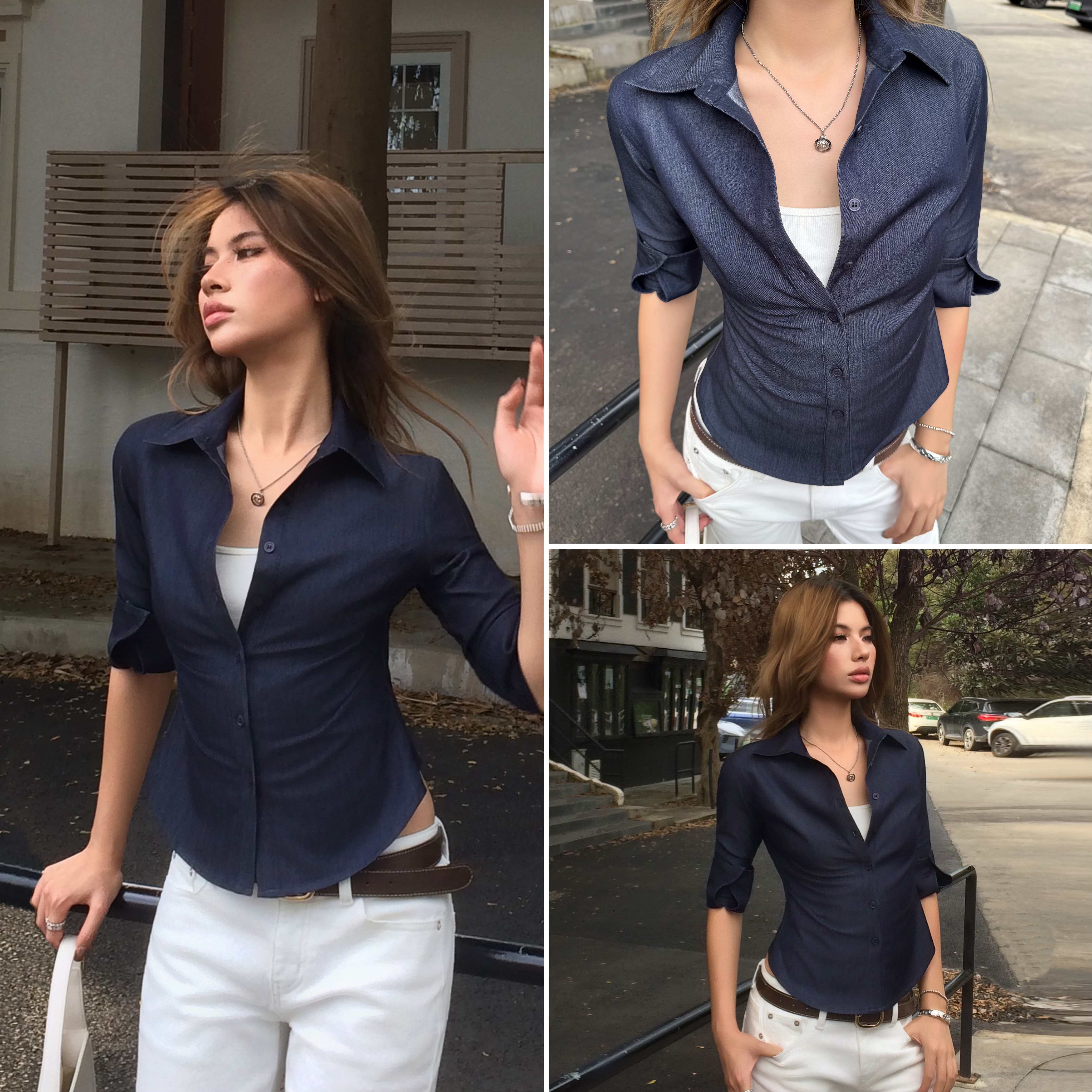 Audwyn imitation denim mid-sleeve slim shirt autumn hot girl's new slightly elastic waist slimming front long back short top