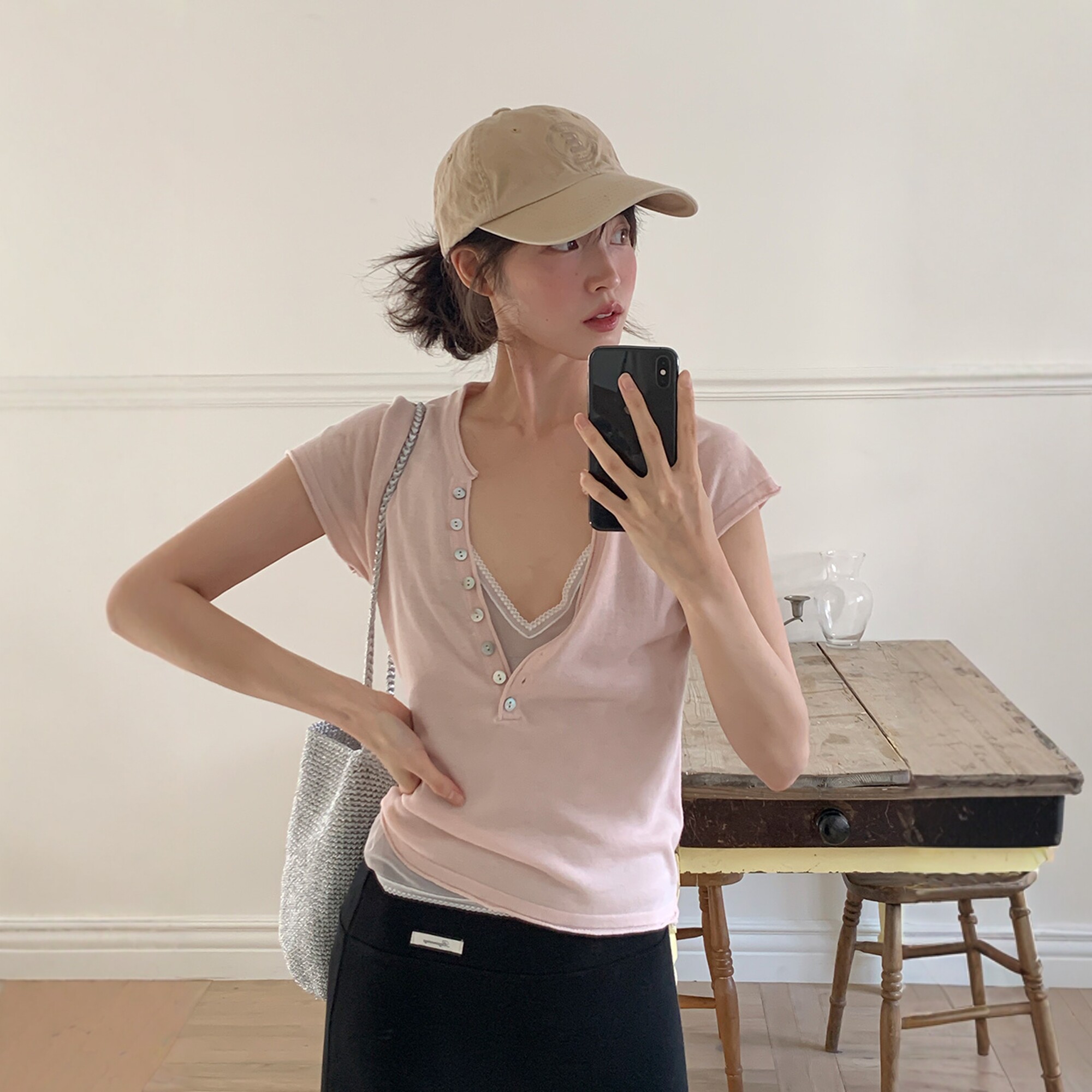 Korean Dongdaemun 1033024 Layered Half-Button Short Sleeve Top
