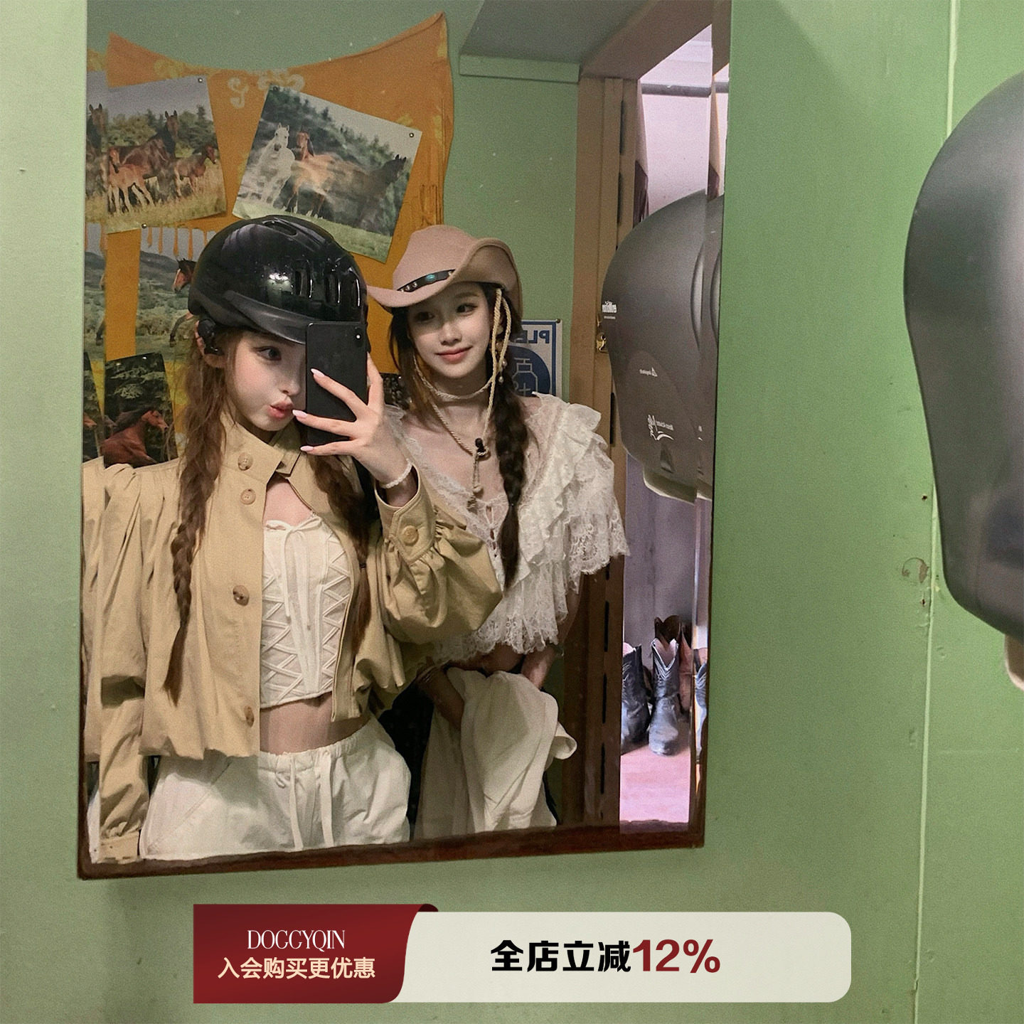 DoggyQin Mia Girl/Small High Waist Pleated Stand Up Collar Short Trench Coat Spring Versatile Long Jacket Top