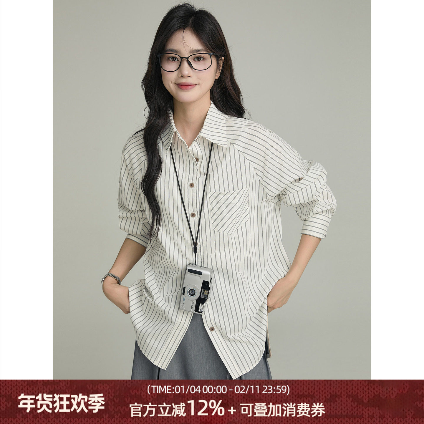 Narrative White Vertical Striped Shirt Top Long Sleeve Women's New Autumn Commuter Loose Underwear Casual Shirt