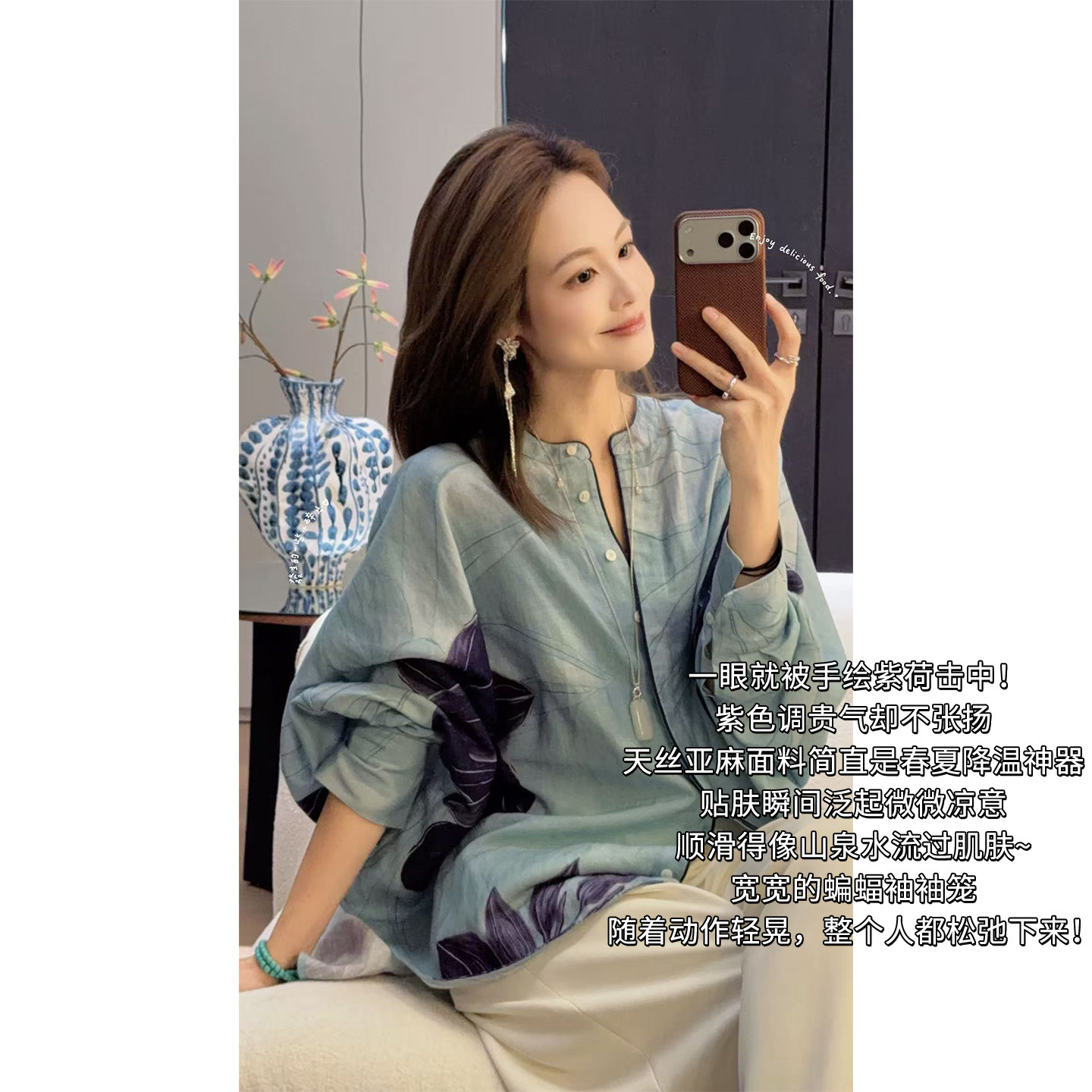 MEIYANG purple lotus shirt lotus pond clear rhyme ~ Tencel linen stand-up collar breasted long-sleeved shirt - Monday