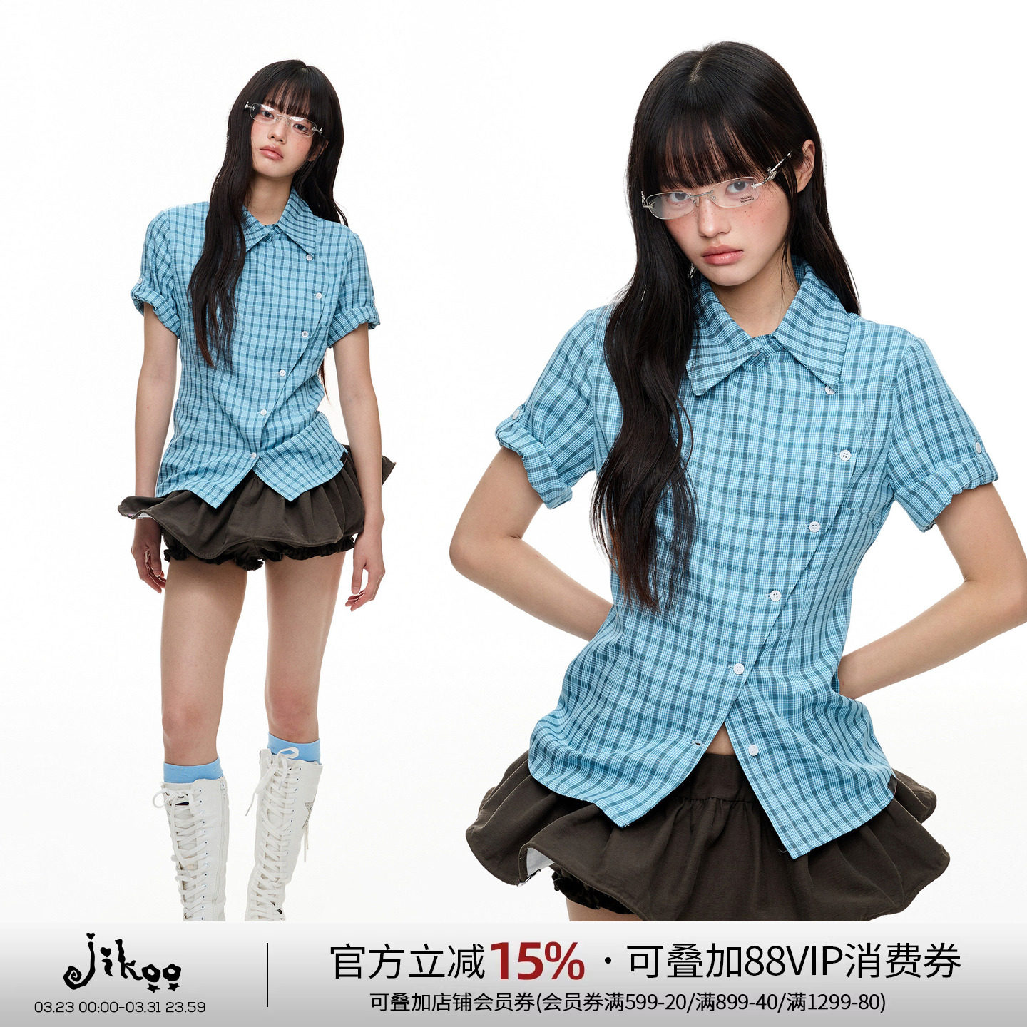 JIKOO blue plaid short-sleeved plaid design shirt women's summer Korean contrast plaid blue top shirt