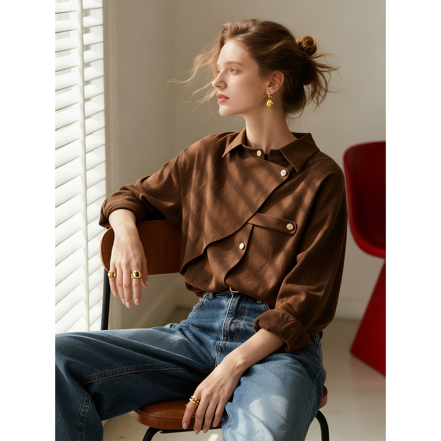 Coffee-colored brushed shirt women's new Maillard layered shirt for autumn and winter 2025 is a beautiful and beautiful little top