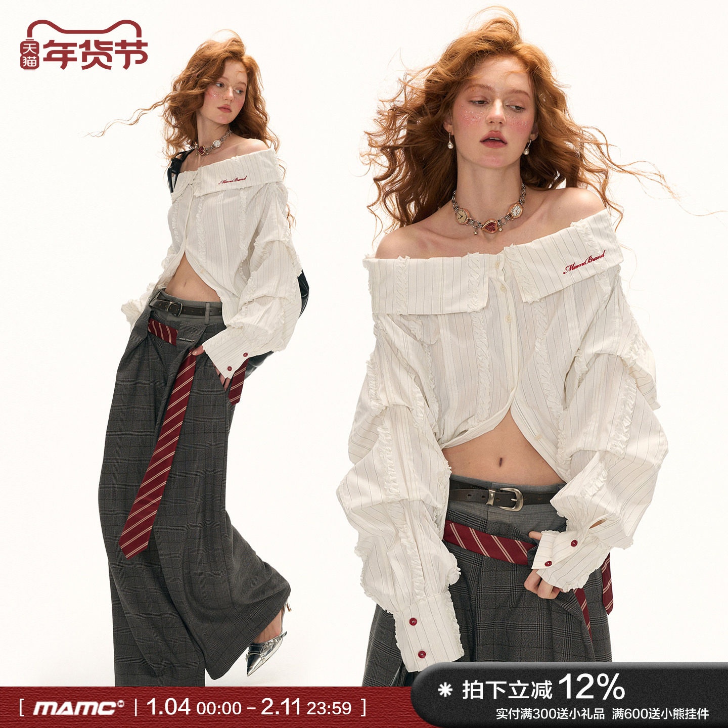 MAMC Big V Layered Striped White Shirt Women's 2025 Fall New One-Shoulder Shirt Loose Long Sleeve Top