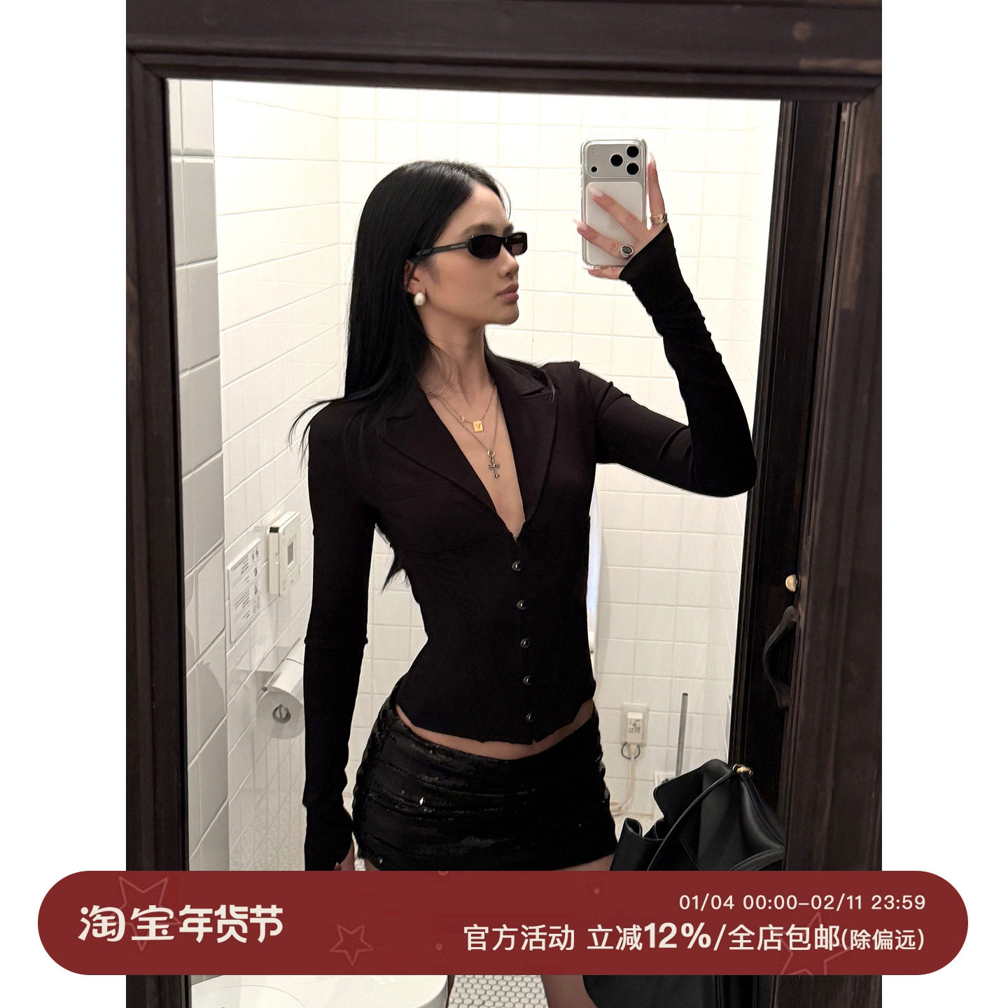 rovente curve plus black deep V herringbone top female hot girl slim waist slim suit collar shirt