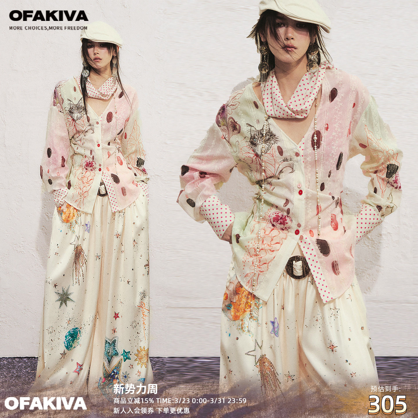 OfAkiva "Horus" Hand-painted watercolor cat print shirt women's polka dot scarf lace-up waist shirt