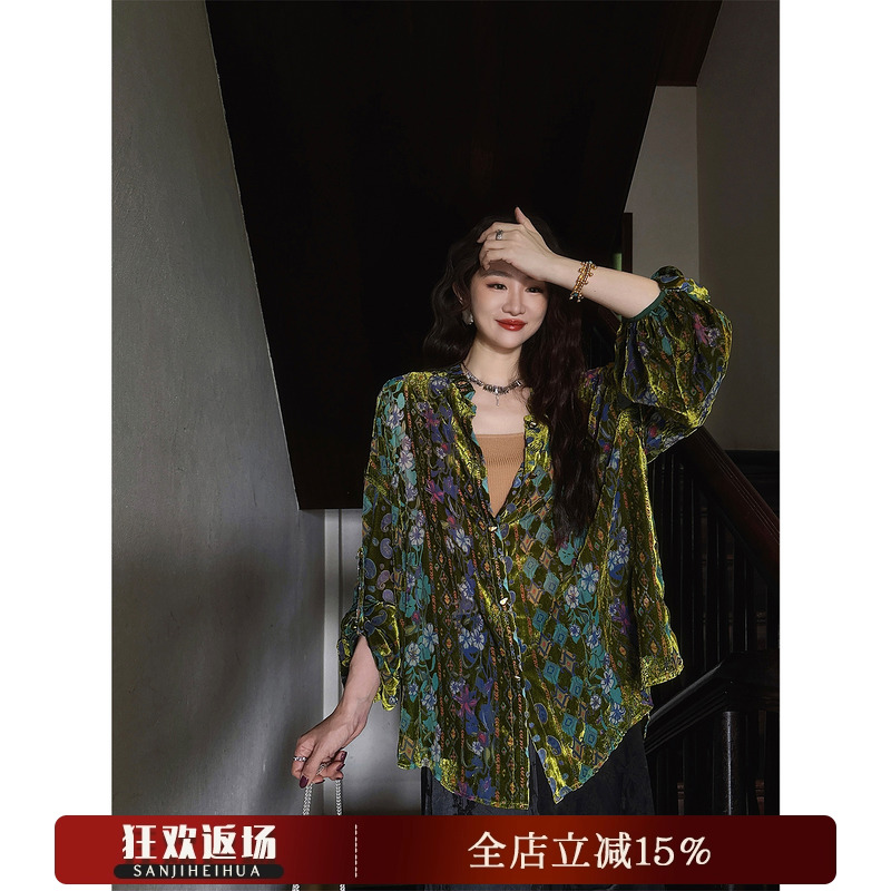 [Yang Mi Mid-Autumn Festival Same style] Sanji black flower [Flower window shadow] new Chinese national velvet blouse shirt women's jacket