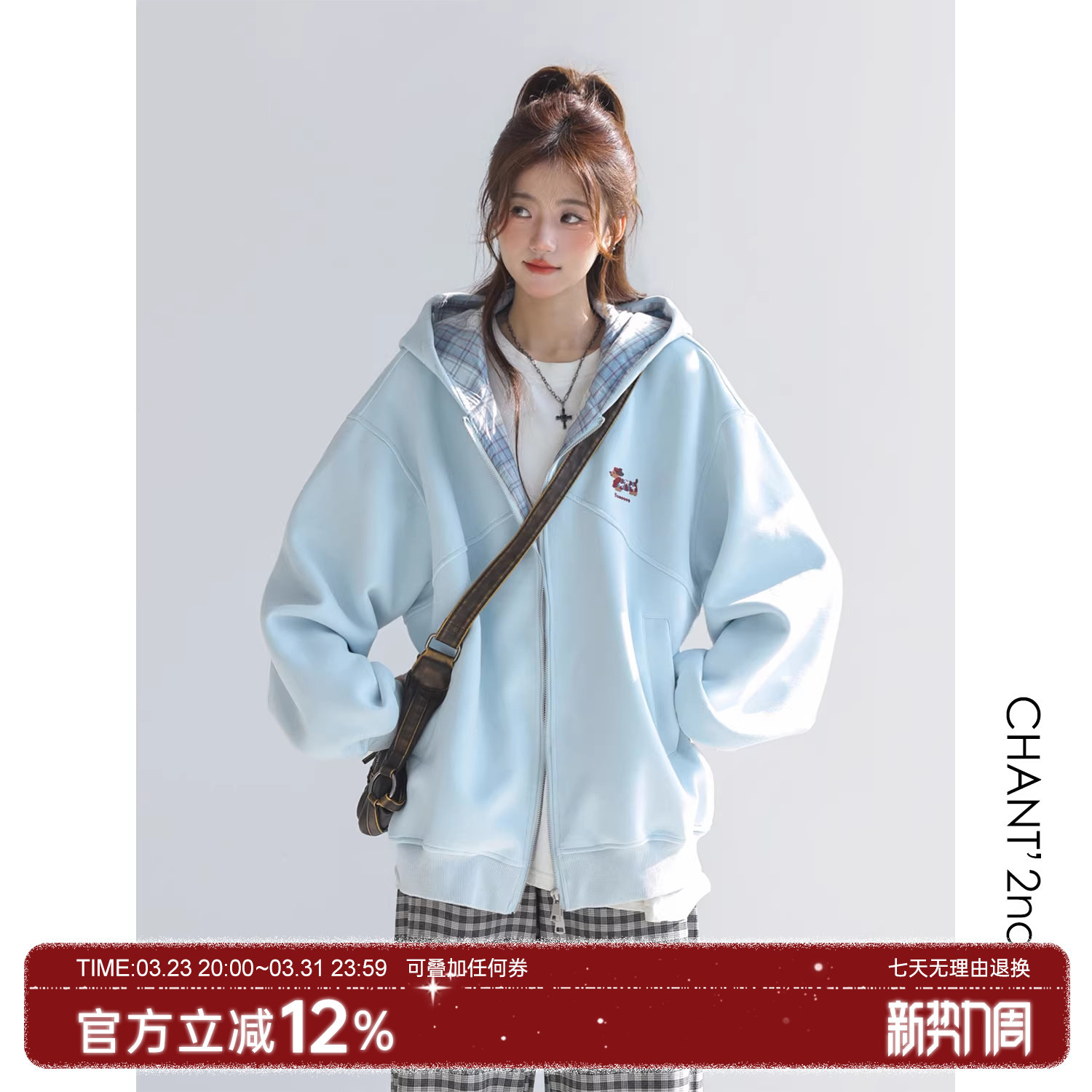 "CHANT2nd" Korean plaid patchwork dachshund embroidered jacket women's spring and autumn lazy loose sweatshirt cardigan