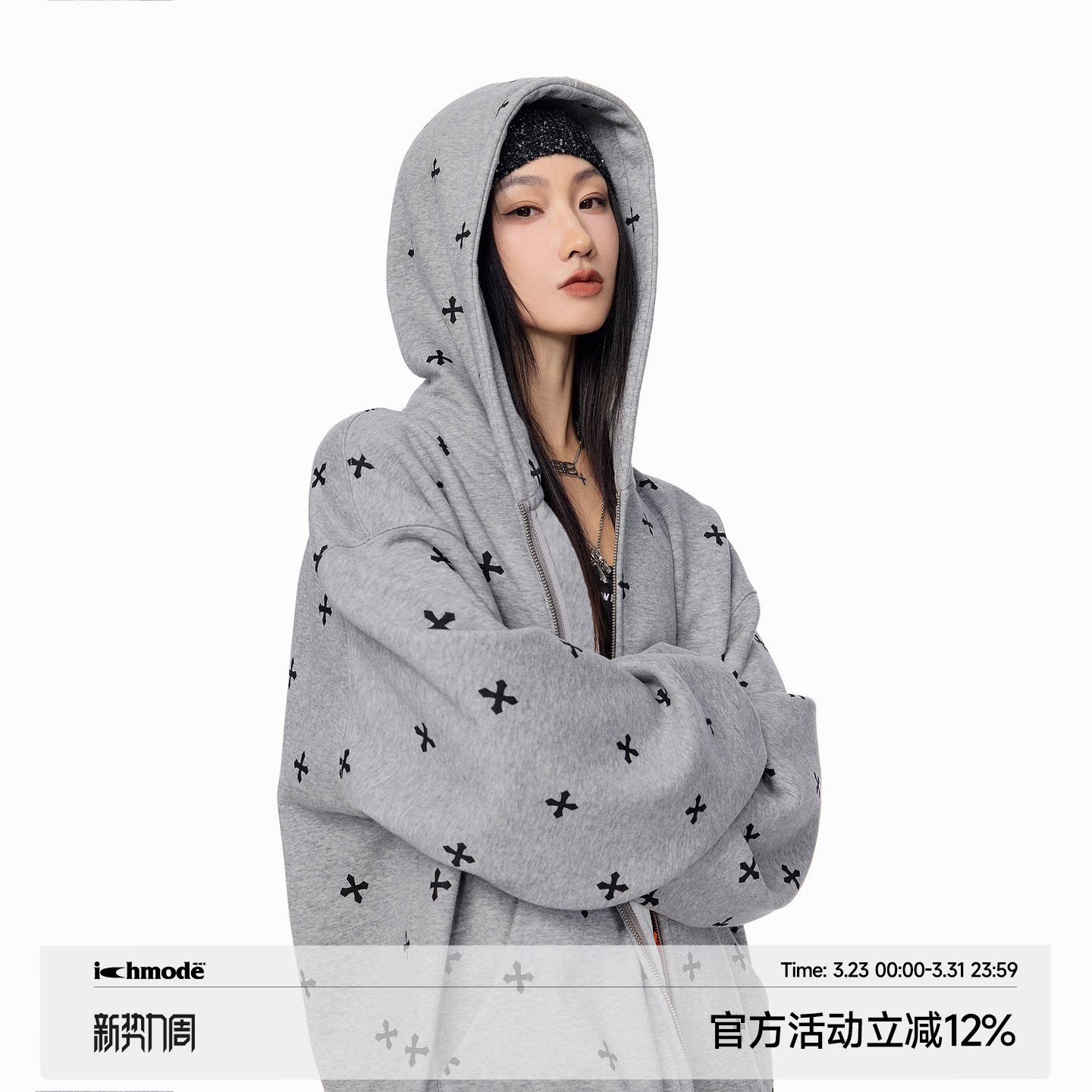 ICHMODE star cross full print gray sweatshirt jacket women's spring new loose cardigan top