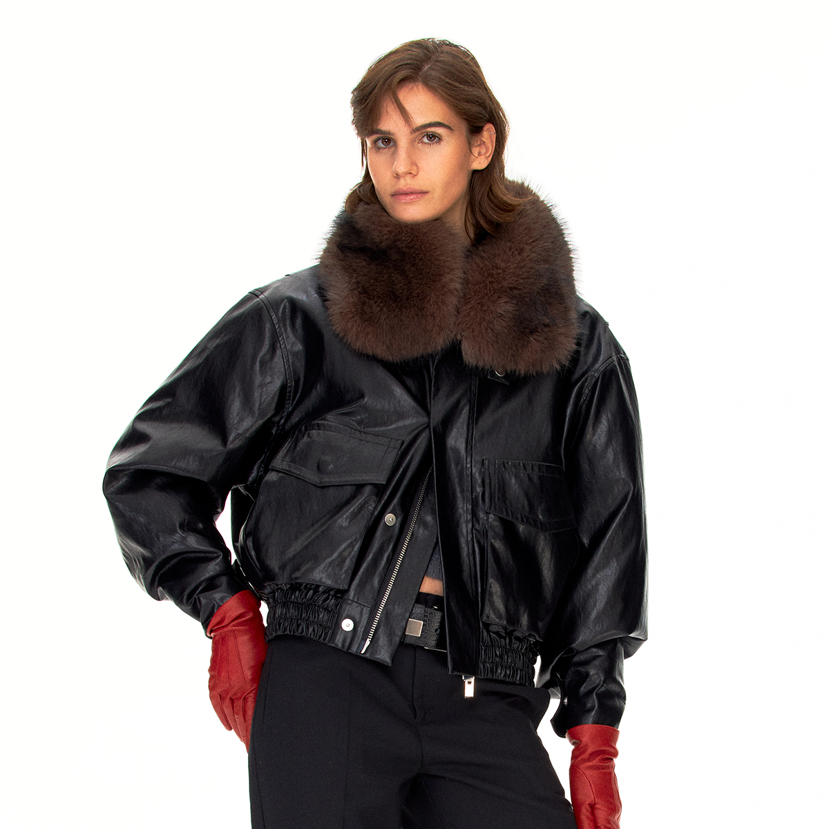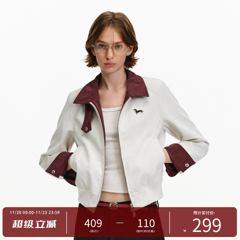 PCLP contrasting collar leather jacket spring and autumn new national tide brand splicing design short zipper short jacket for women