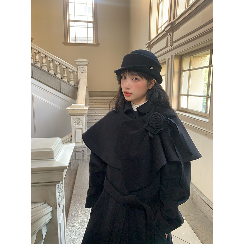 Black Hepburn style cropped woolen cape coat women's autumn and winter thickening 2025 new high-end woolen jacket