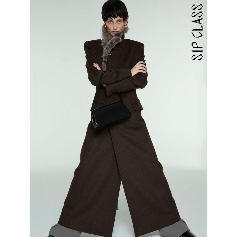 SIP CLASS designer brand burgundy fur collar woolen coat women's winter long stand-up collar woolen jacket