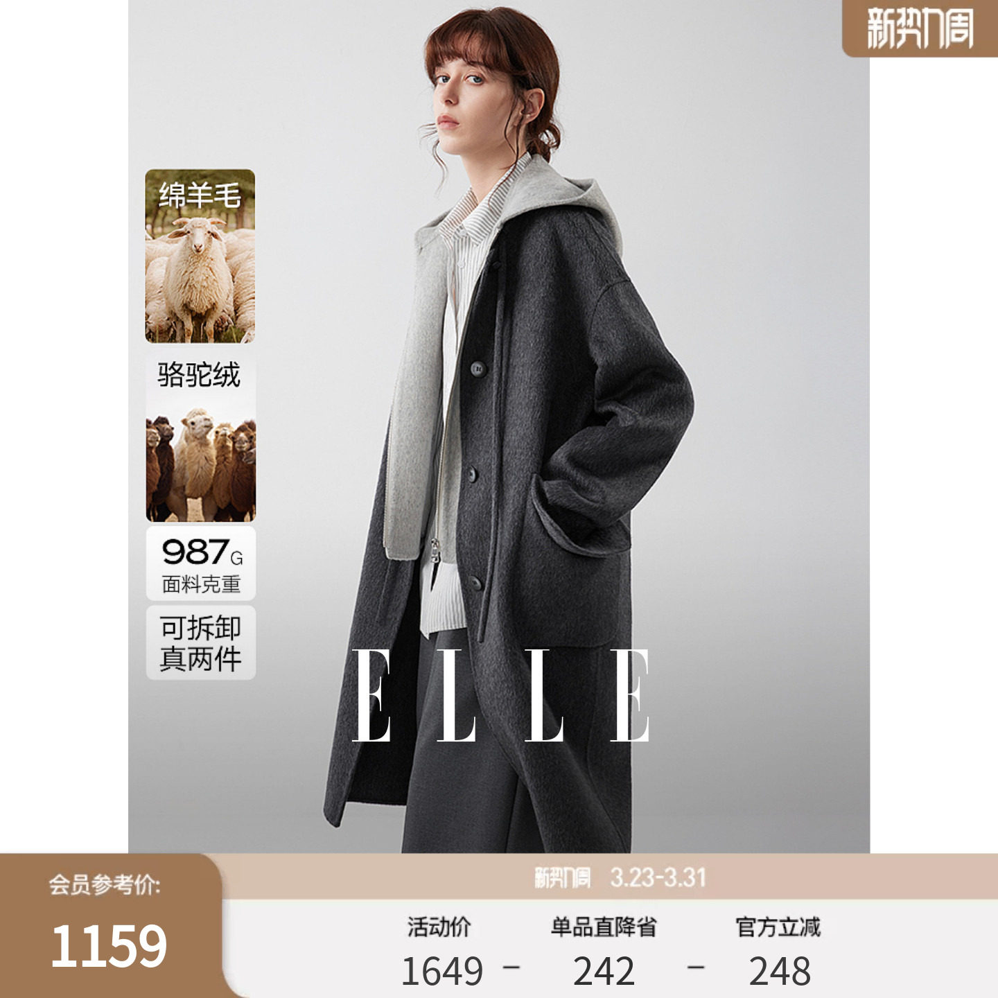 [Comfortable silhouette] ELLE French midi reversible dweed coat women's 25 winter new high-end woolen jacket