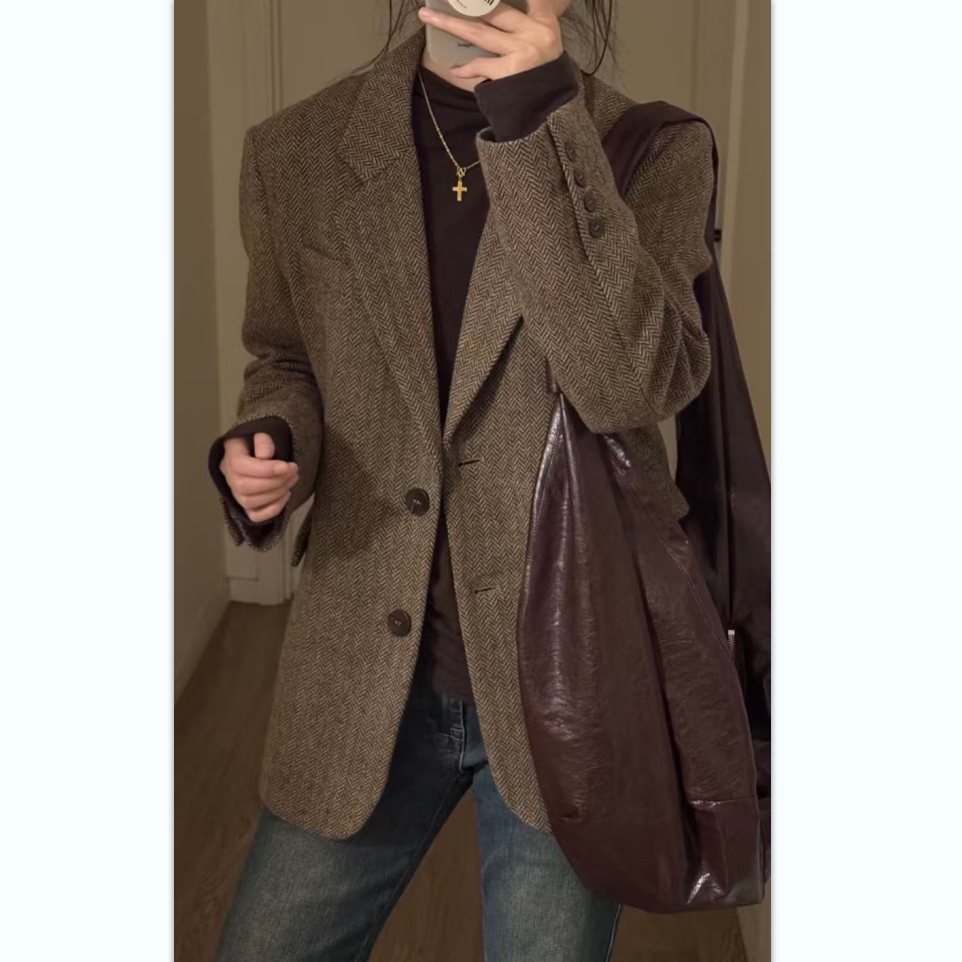 Woolen blazer women's 2026 spring and autumn, Korean coffee color retro herringbone pattern suit, woolen coat, small man