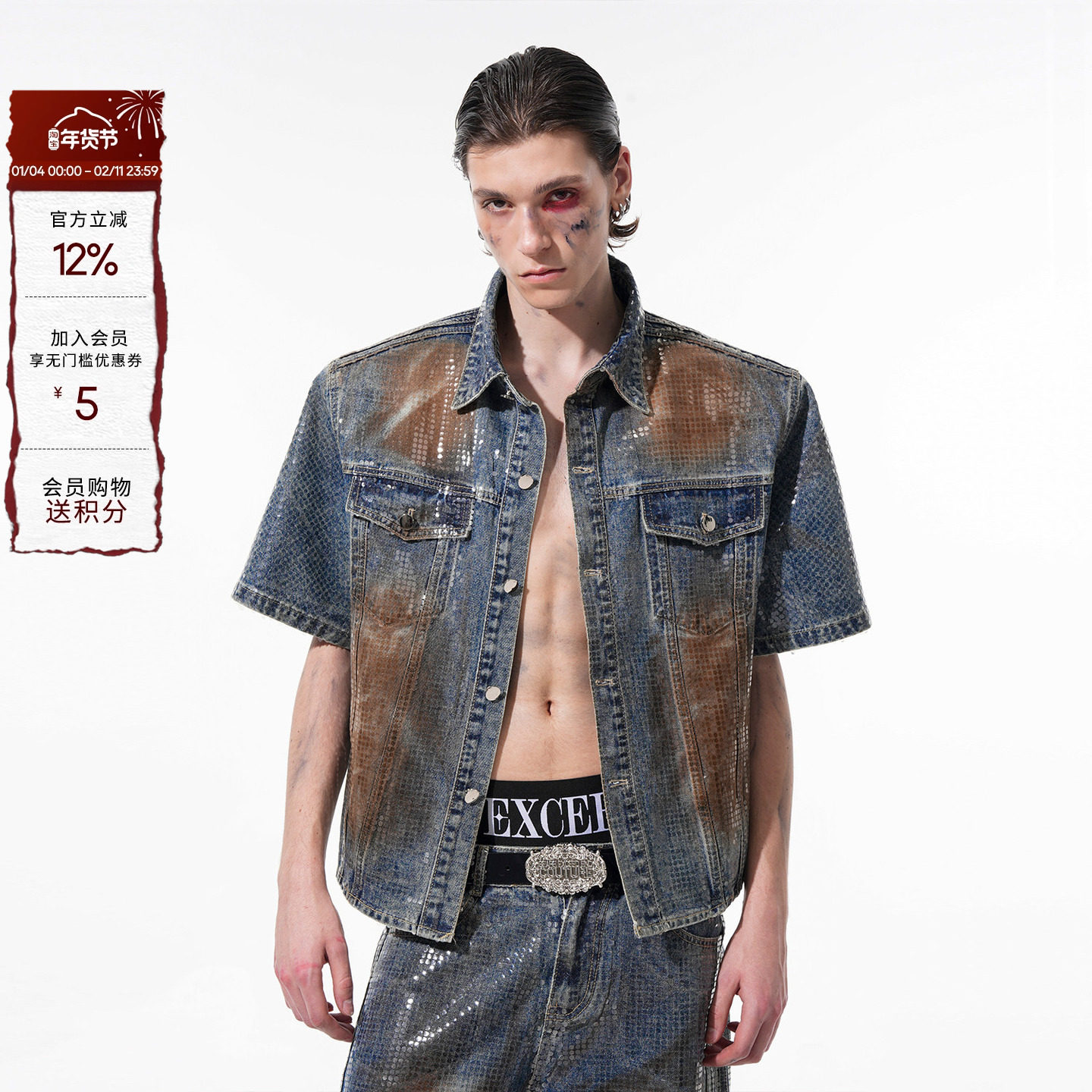 STARTEXCEEDEND Niche hot stamping bead piece short denim jacket men's spring and summer retro shoulder pad short-sleeved jacket
