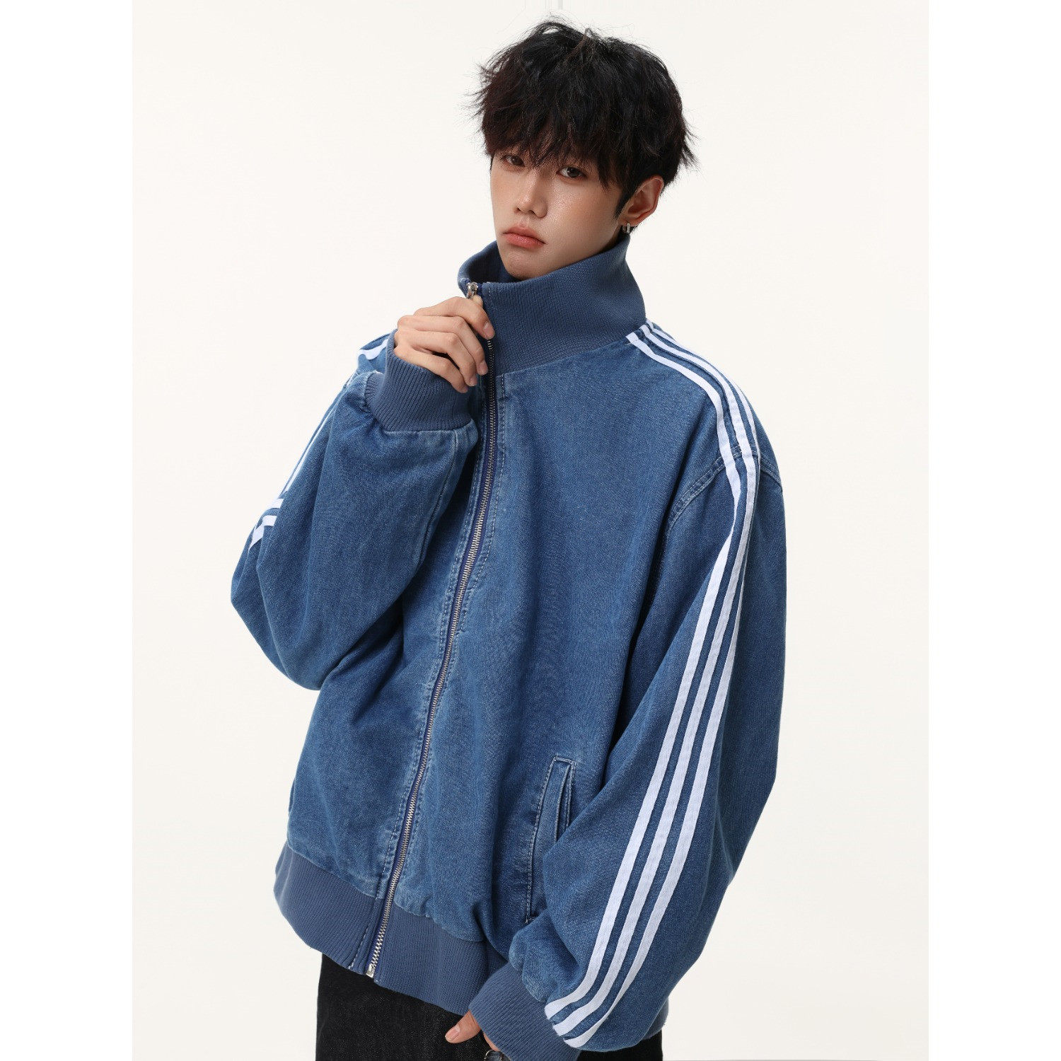 Washed blue three-bar cropped denim jacket men's spring and autumn American vintage striped stand-up collar sports jacket