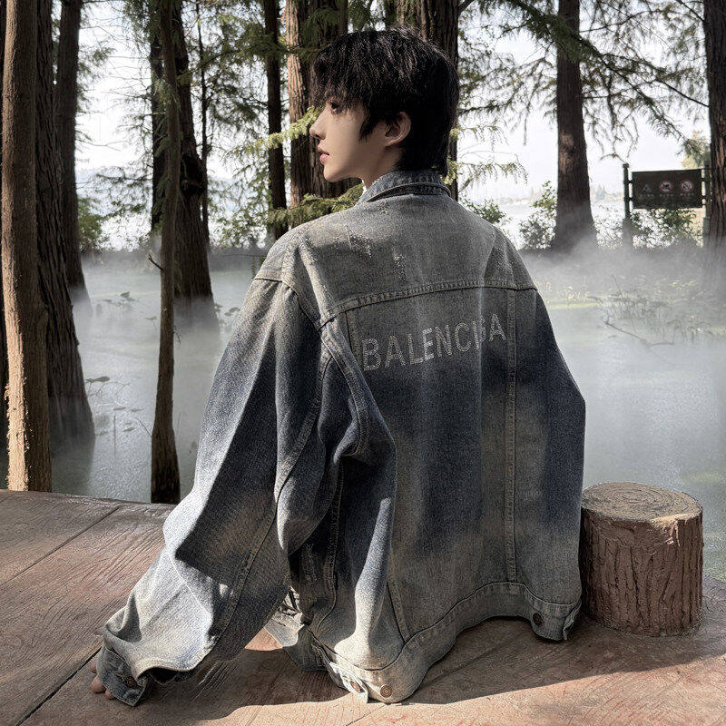 Dark blue denim jacket autumn new men's American street high-end ruffian handsome retro style denim jacket trend