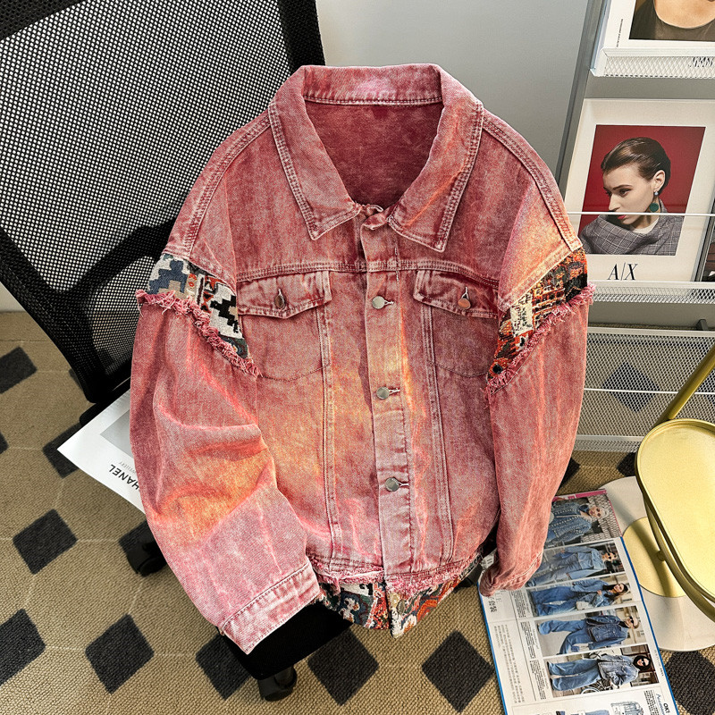 Washed old pink denim jacket men's spring and autumn American ins retro loose versatile ruffian handsome casual jacket