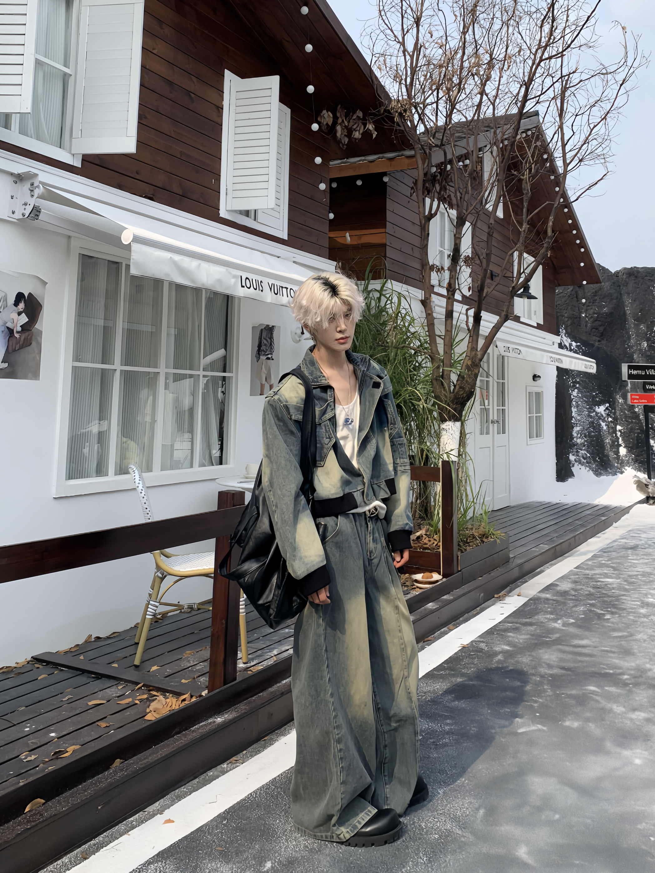 76STREET American vintage washed original denim jacket men's and women's tailoring patchwork airplane buckle short wide lapel jacket