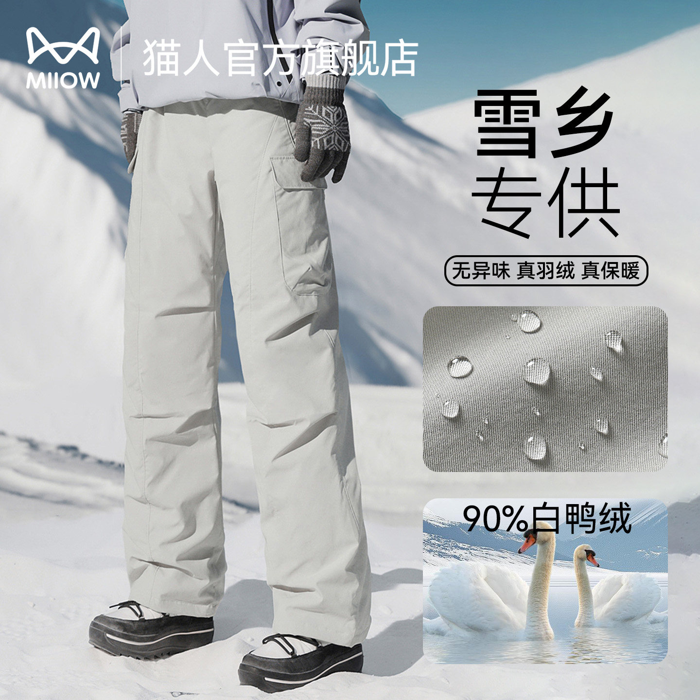 Cat man white down pants, women's waterproof softshell assault pants, autumn and winter thickened workwear, loose straight warm pants