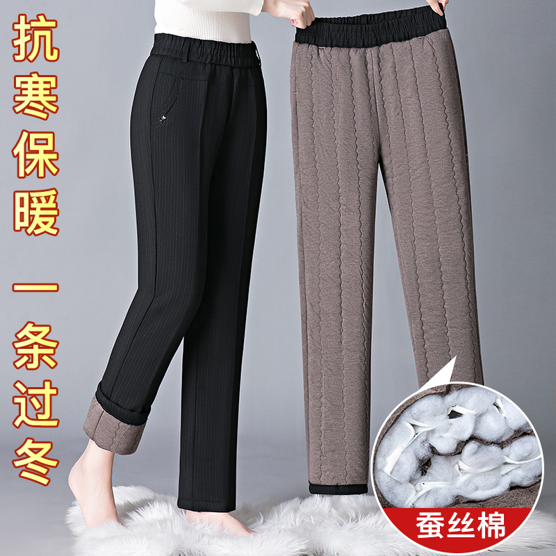 Silk cotton pants women, middle-aged and elderly mothers in winter, fleece, thickened high-waisted warm padded padded straight leg, casual pants outside