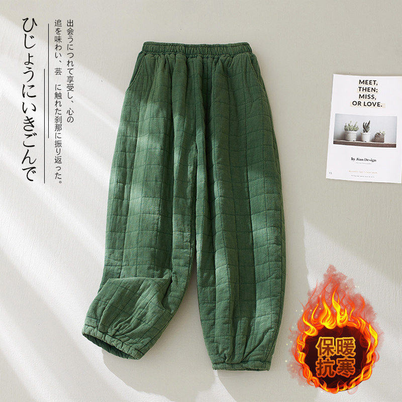 Literary and artistic padded warm bloomers 2024 new quilted plaid cotton and linen long pants for women's cotton pants in autumn and winter