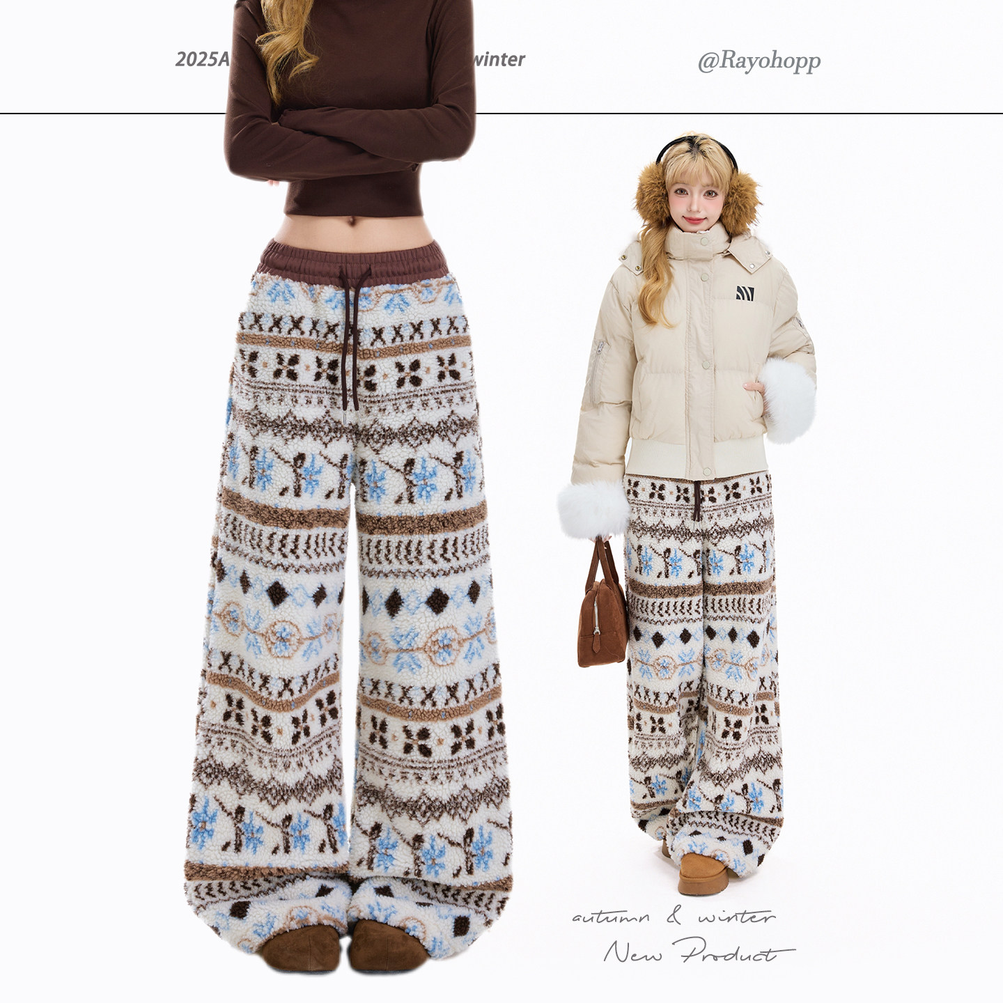 Rayohopp Vintage Fair Isle Lamb Fleece Wide-leg Cotton Pants Women's Winter Thickening Warm Loose Casual Pants Trend