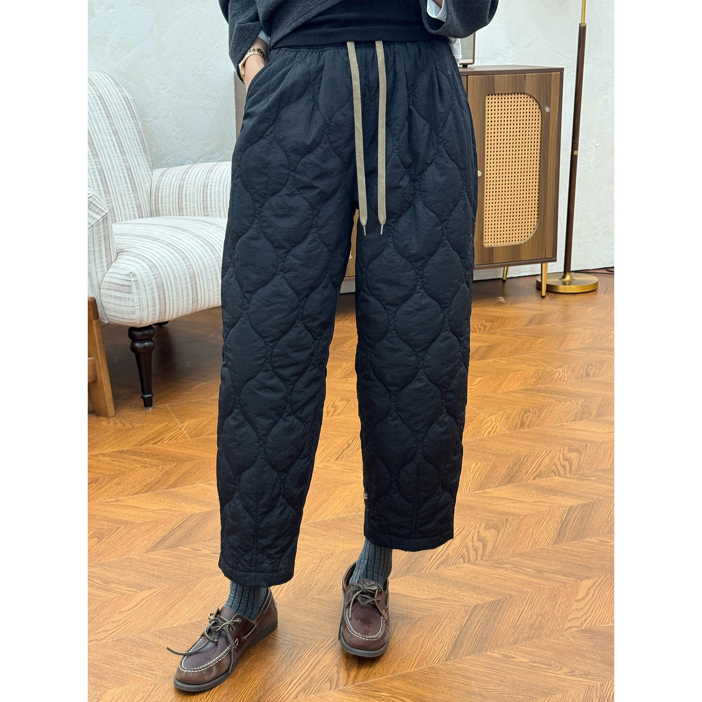 Zhou Langqing, loose black warm cotton pants, women's 2025 new autumn and winter small people wear light straight wide-leg pants