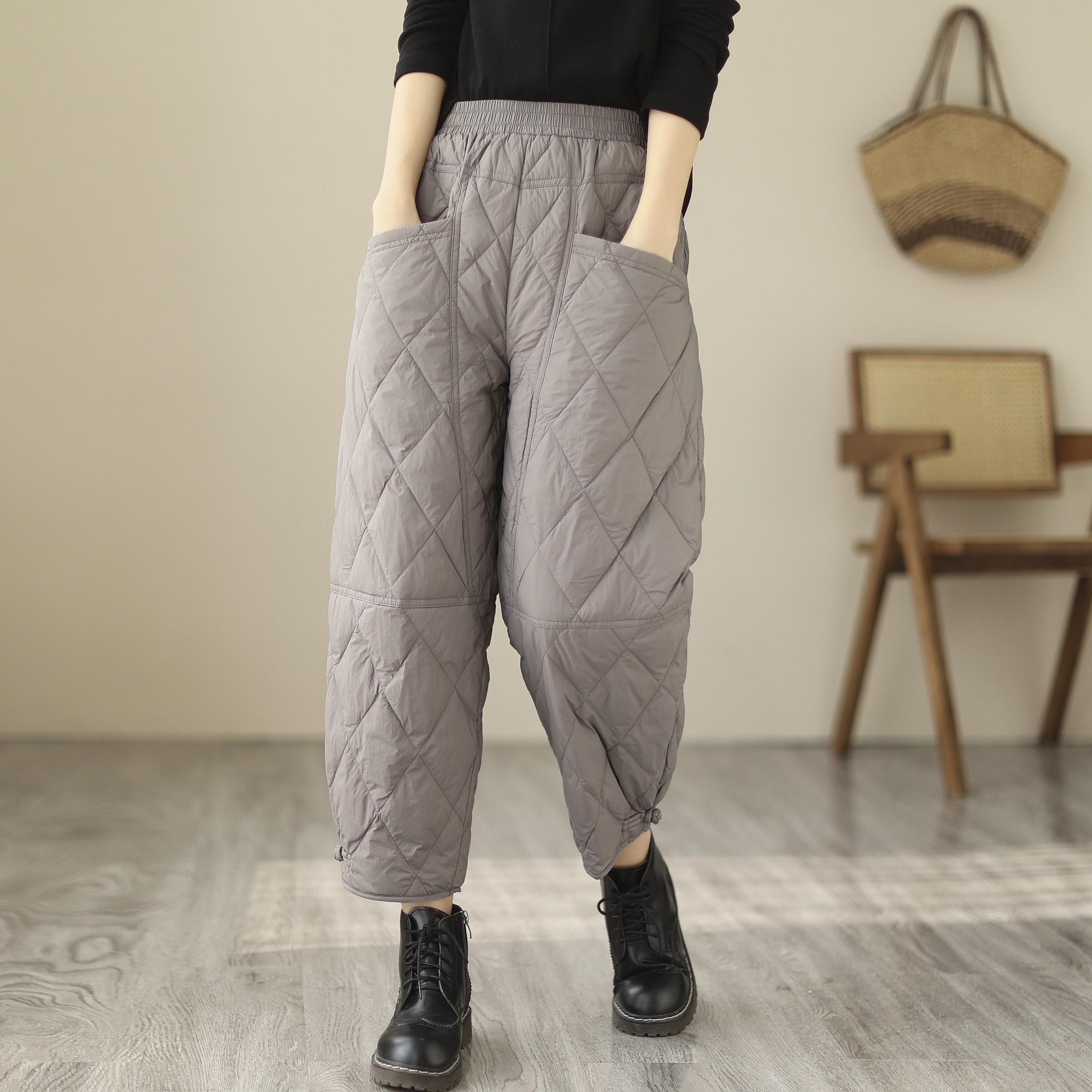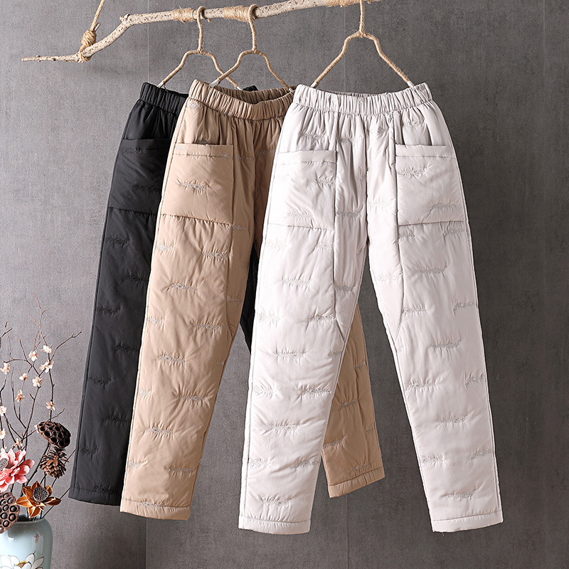 Lightweight down and cotton pants, women wear winter plus-size thickened straight-leg pants to keep warm and loose high-waisted padded embroidered cotton pants