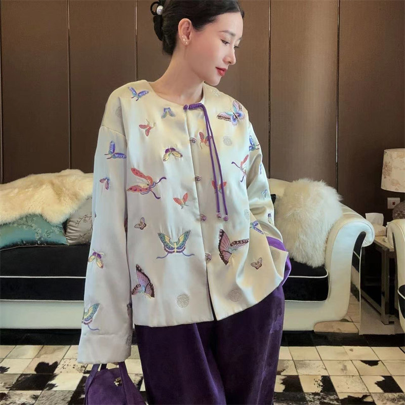 Yang Mi's silk embroidery new Chinese top female wealth purple contrasting temperament fringed buckle jacket autumn Q4115