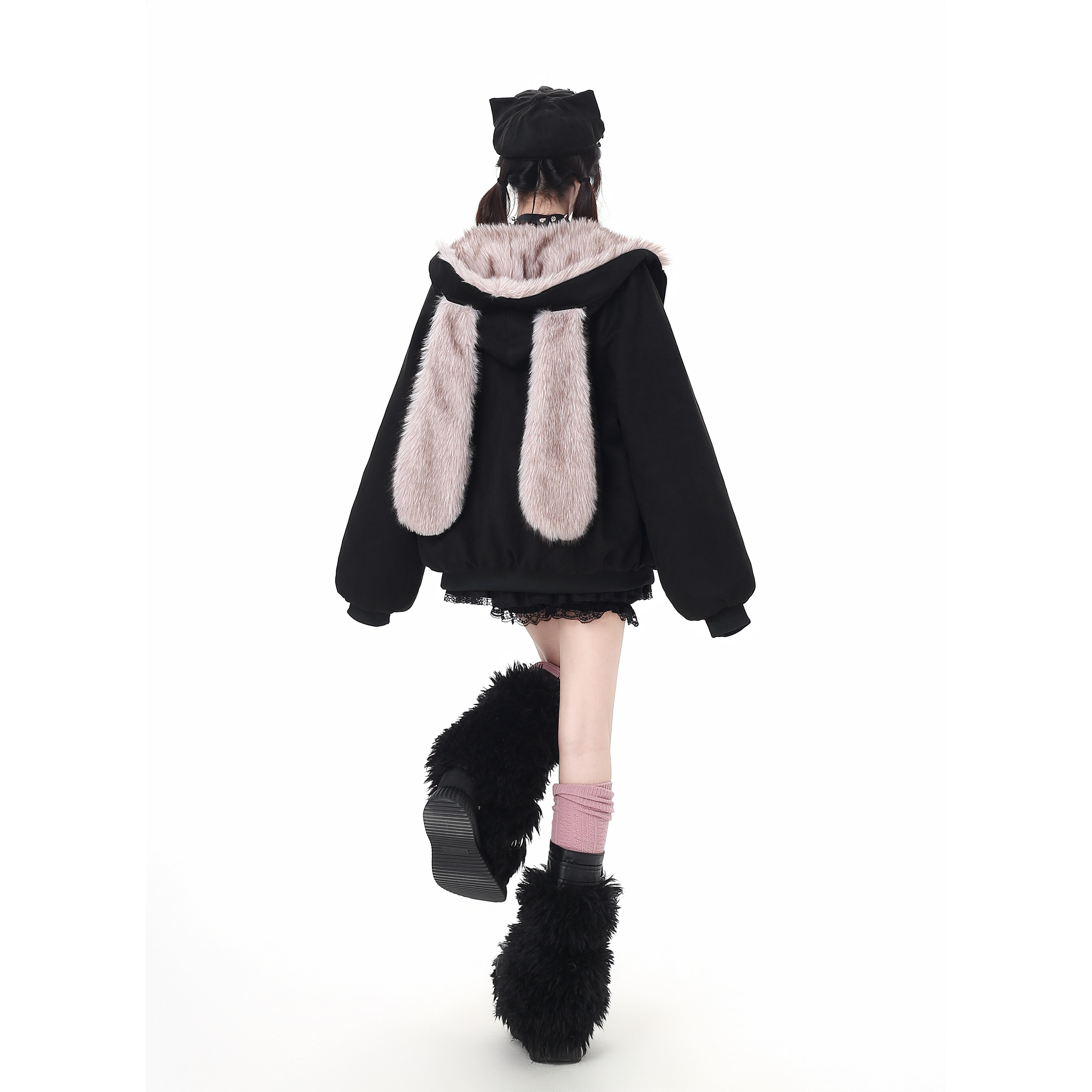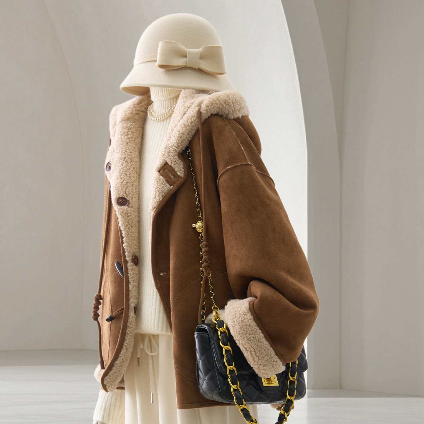 4U4U brown reflex lambswool jacket female Korean style imitation fur retro hooded winter thermal top
