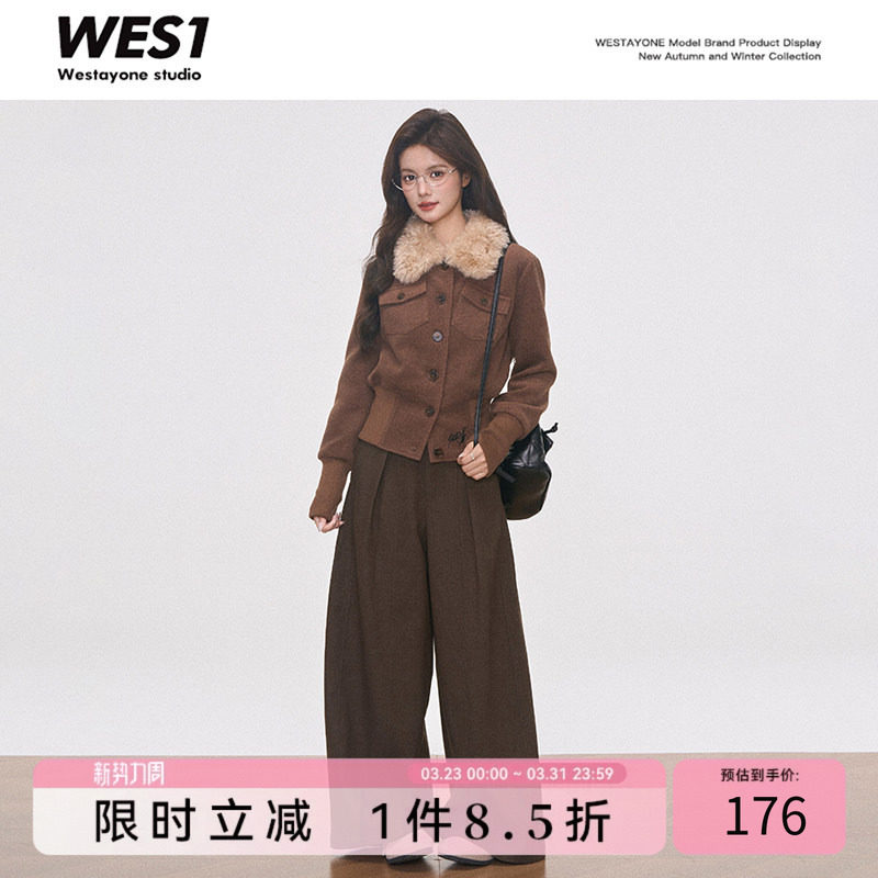 11.6 New product WESTAYONE coffee color short woolen jacket slim padded clothes women's small + wide-leg pants
