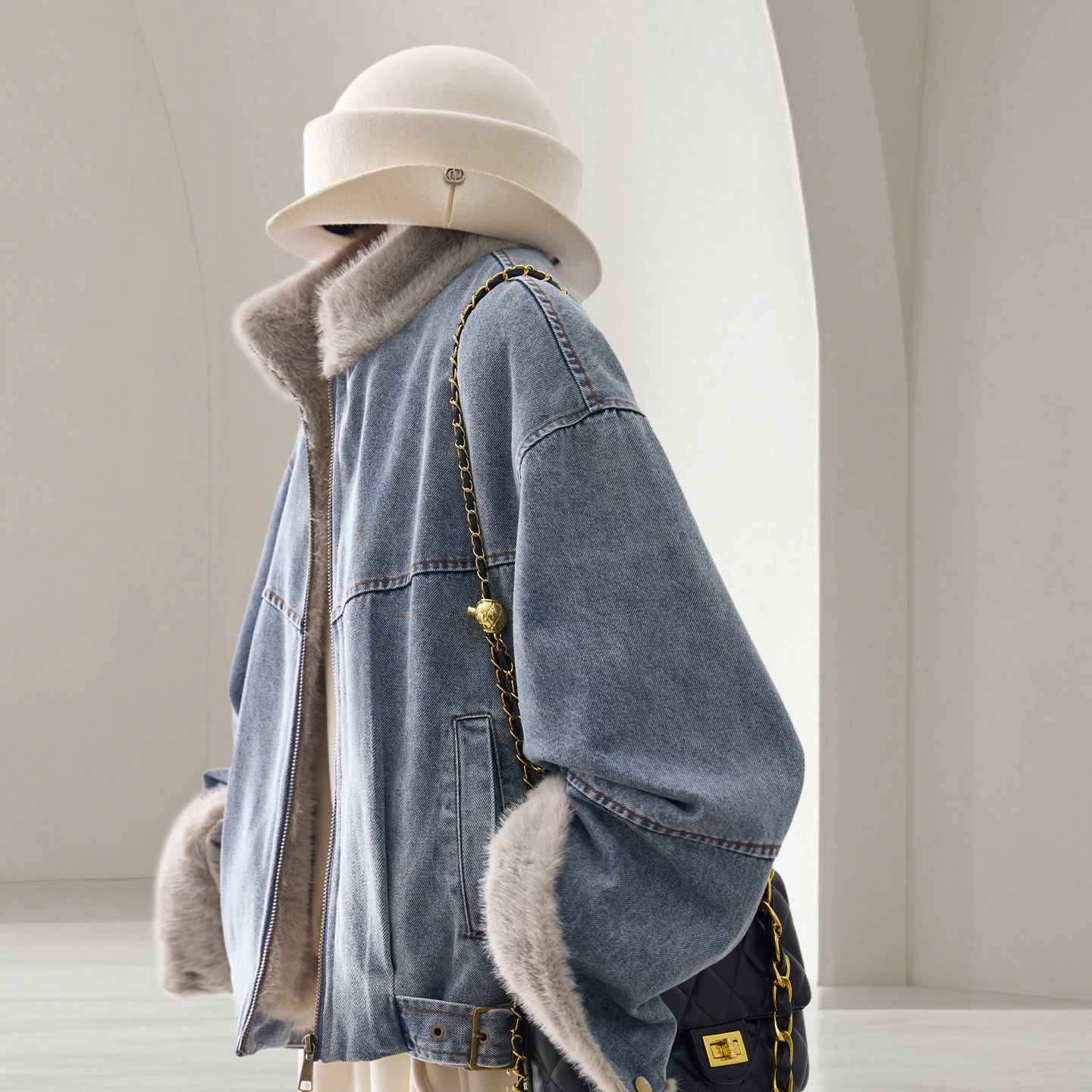 4U4U stand-up collar fur splicing denim pie overcomes women's popular Korean super good-looking imitation mink fur jacket this year