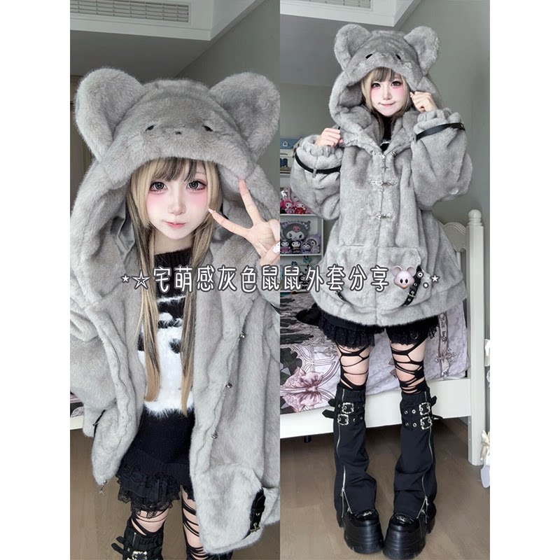 Japanese house cute mouse big ears lamb wool jacket women's winter loose thickened warm plush cotton clothes