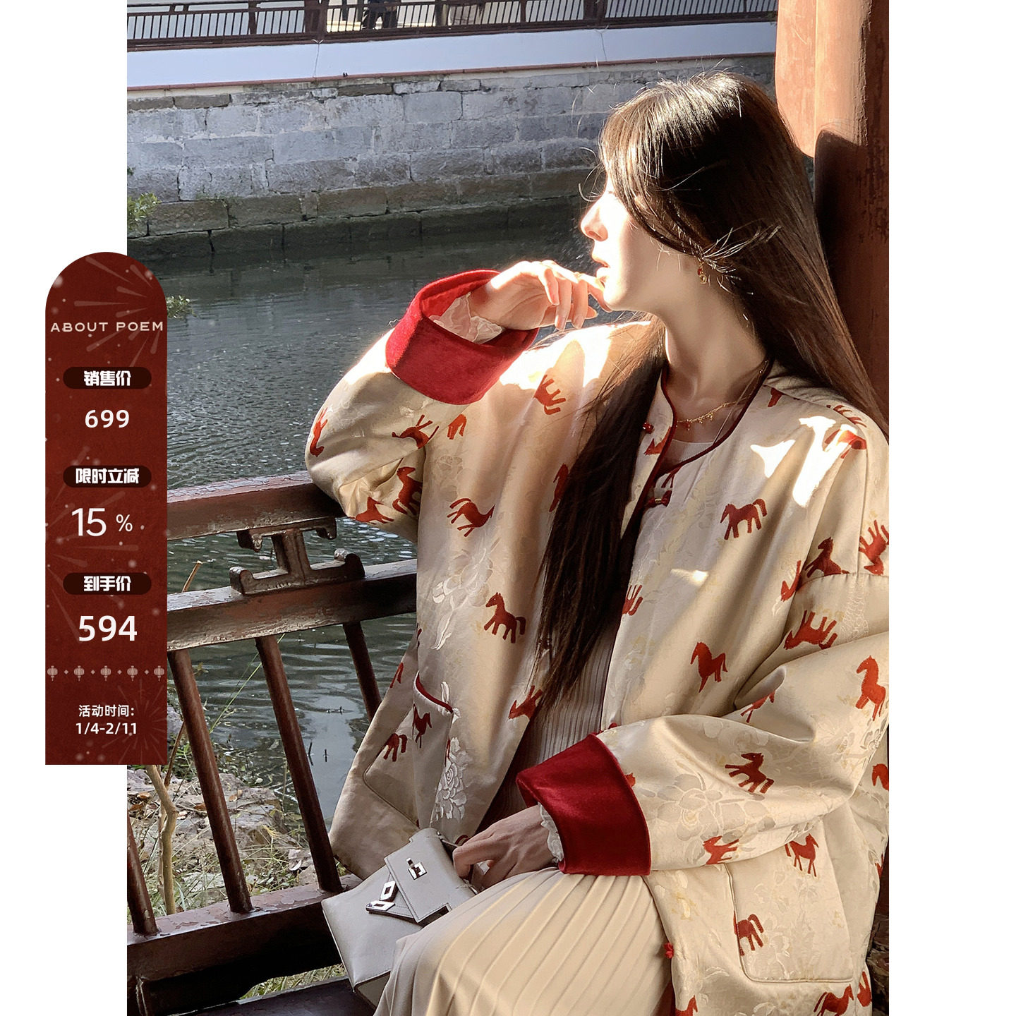 Xia Shiwen "Horse Stepping on Spring" double-sided double-material Chinese cotton clothing high-density silk print crew neck jacket