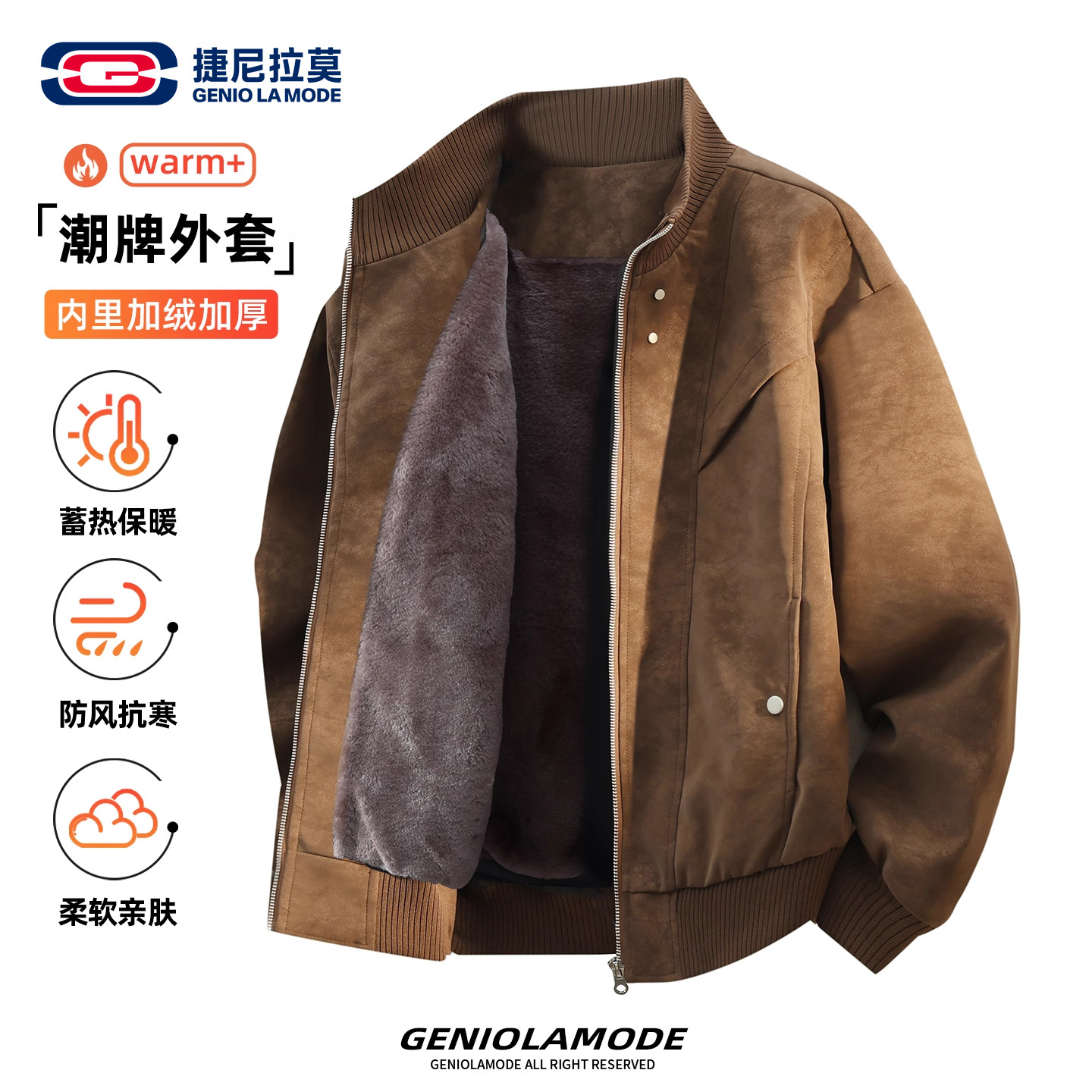 GENIOLAMODE American Barnes Leather Jacket Winter Padded Men's Fleece Thickened Baseball Collar Jacket