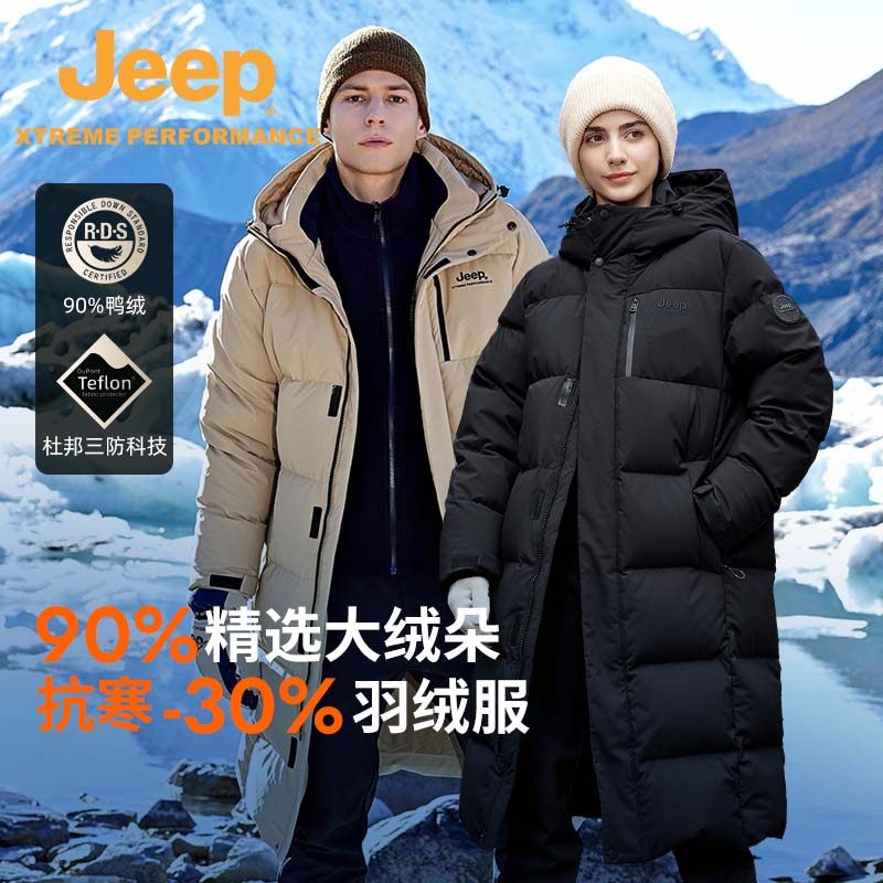Jeep outdoor ski suit couple three-proof knee-length down jacket is warm and thick, and the Northeast cold-resistant down jacket is thickened