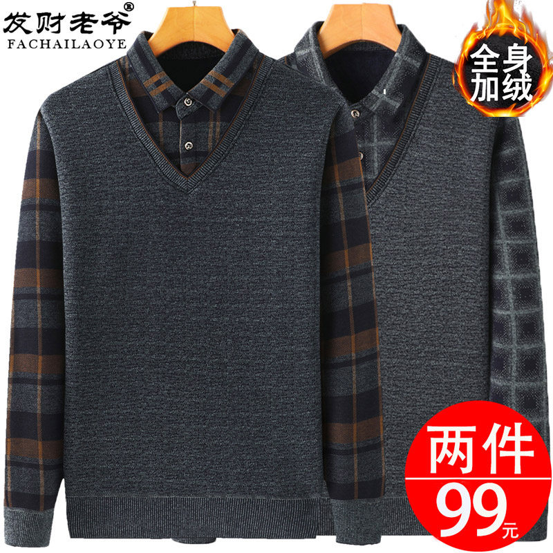 Dad sweater with fleece thickened men's middle-aged loose knitted sweaters middle-aged and elderly warm winter clothes fake two sweaters men's clothing