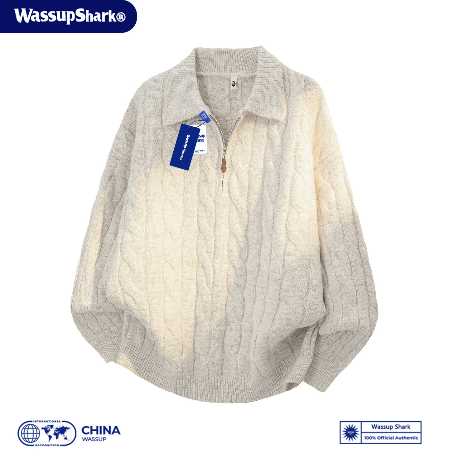 WASSUP SHARK vintage style lapel half zipper twist knit men's loose lazy style pullover sweater