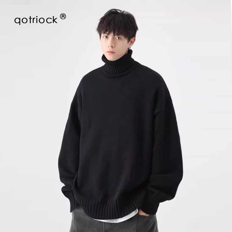 QOTRIOCK turtleneck sweater men's winter loose solid color fleece thickened warm couple knitted base shirt thread