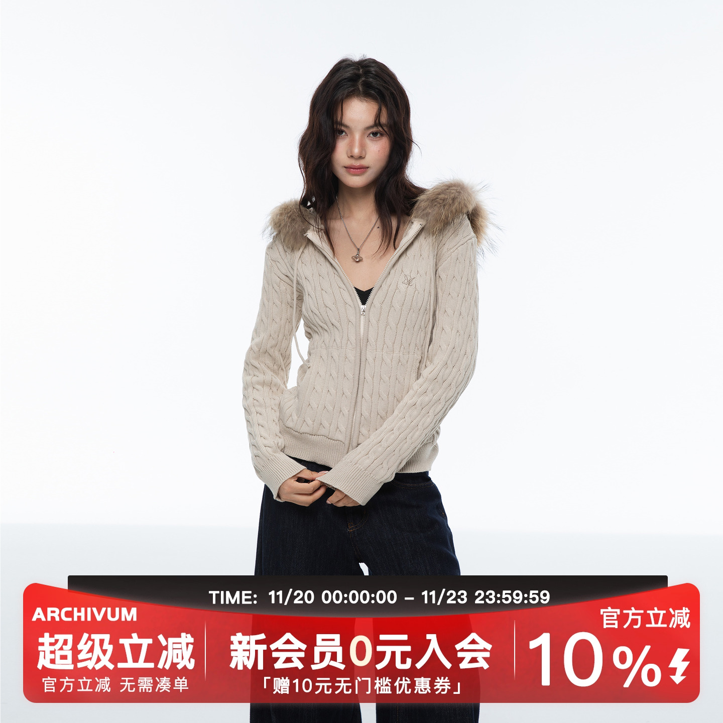 Archivum embroidered logo detachable fur collar hooded versatile pullover knit twist sweater cardigan coat