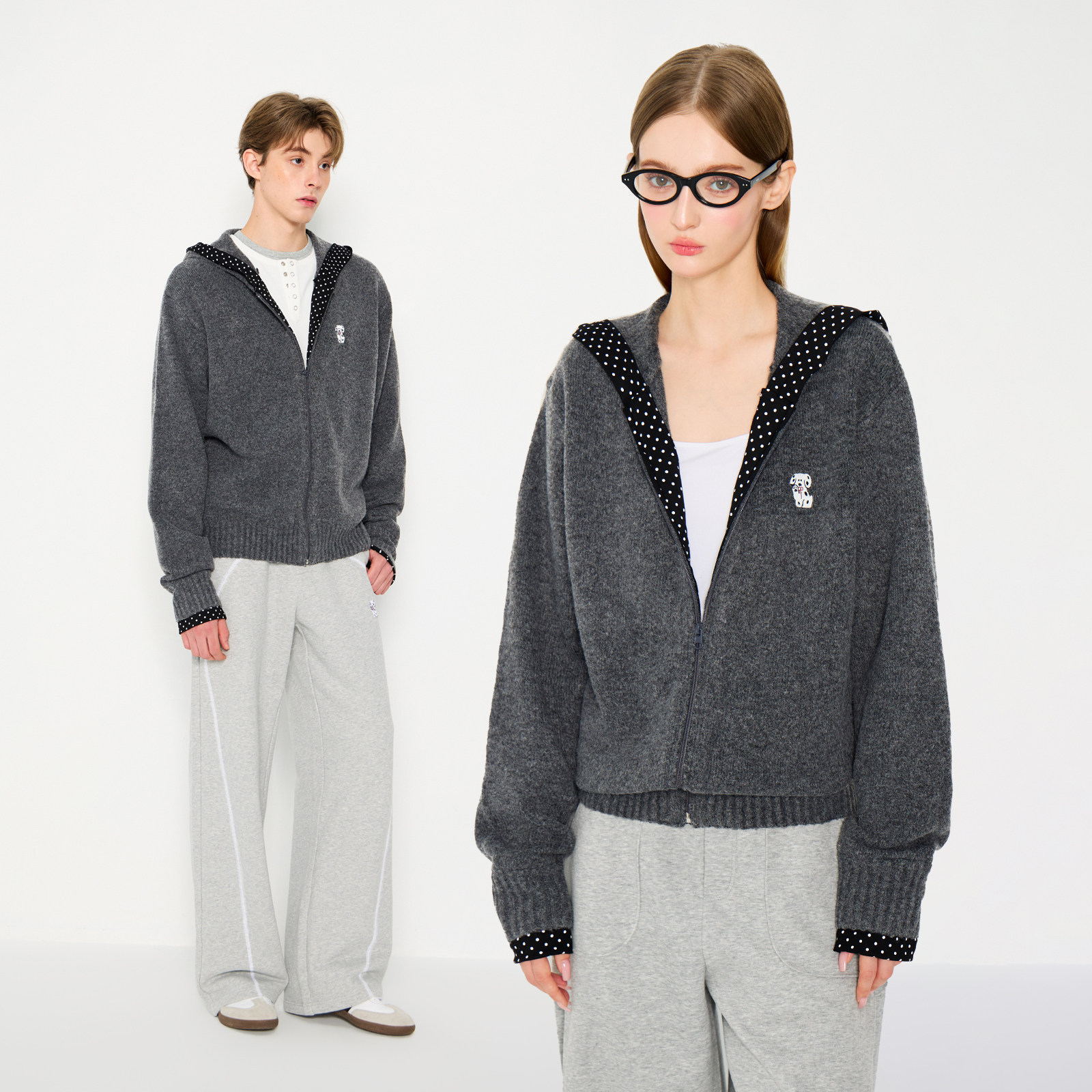MYSAMESAME polka dot patchwork design sense hooded sweater cardigan men's and women's fall and winter loose zipper knit jacket