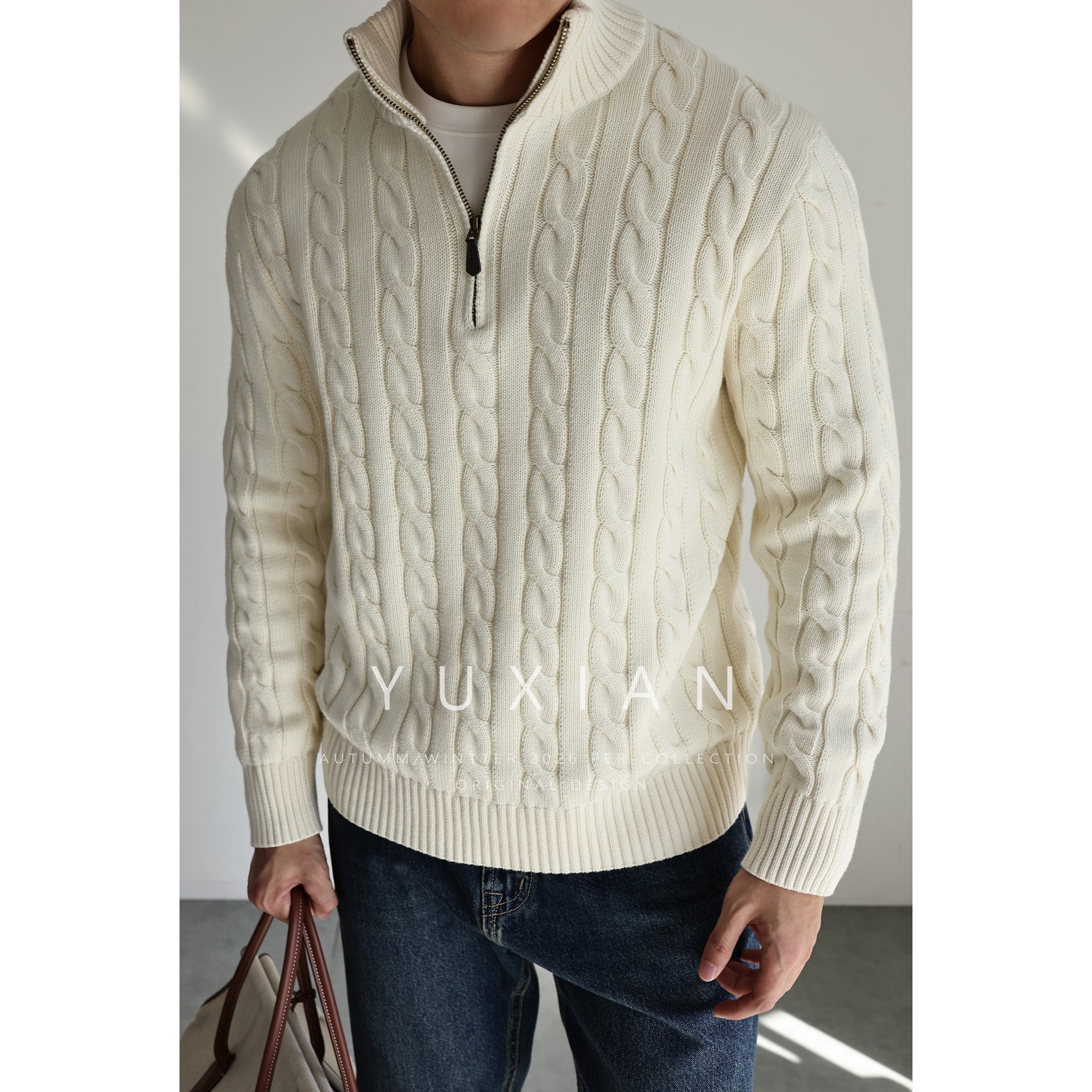 YUXIAN Italian 100% combed cotton vintage button-down half zipper knitted long sleeve cotton sweater vintage autumn and winter men