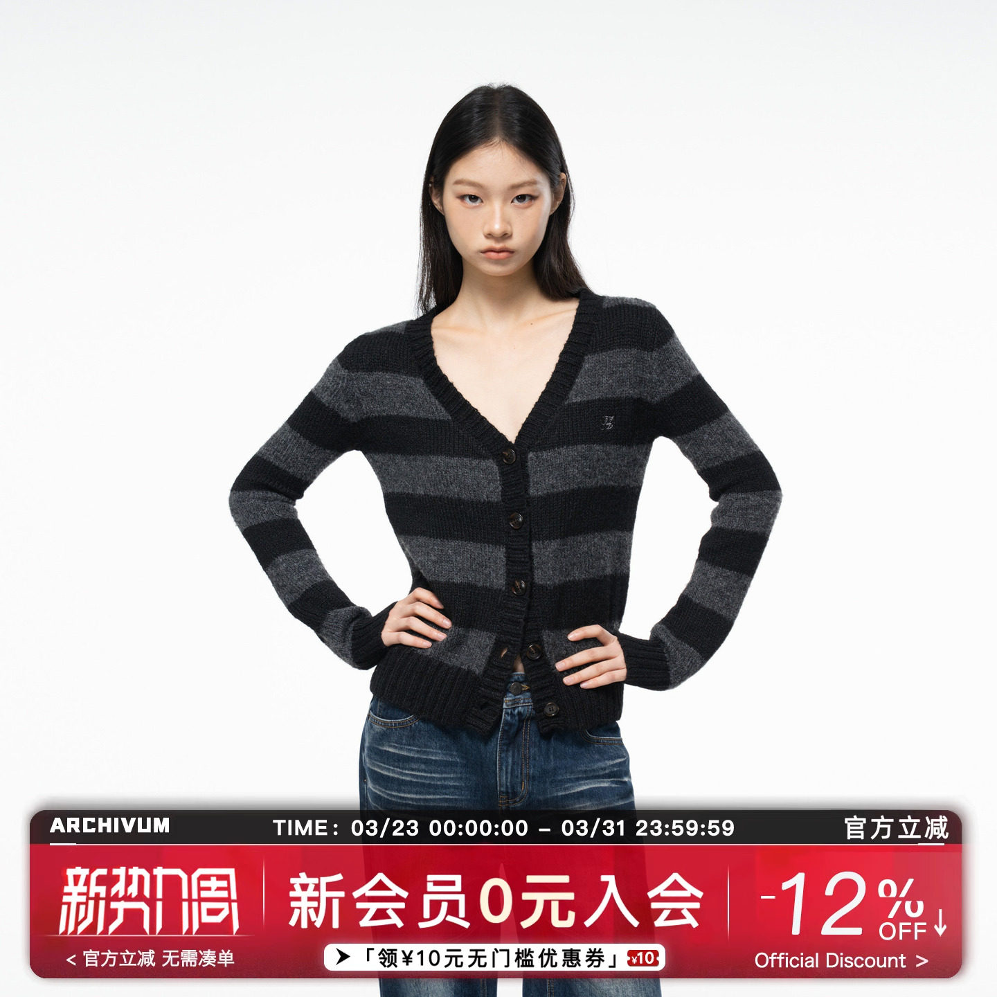Archivum black and gray striped lazy V-neck wool-blend sweater knitted cardigan women's autumn slim top trend