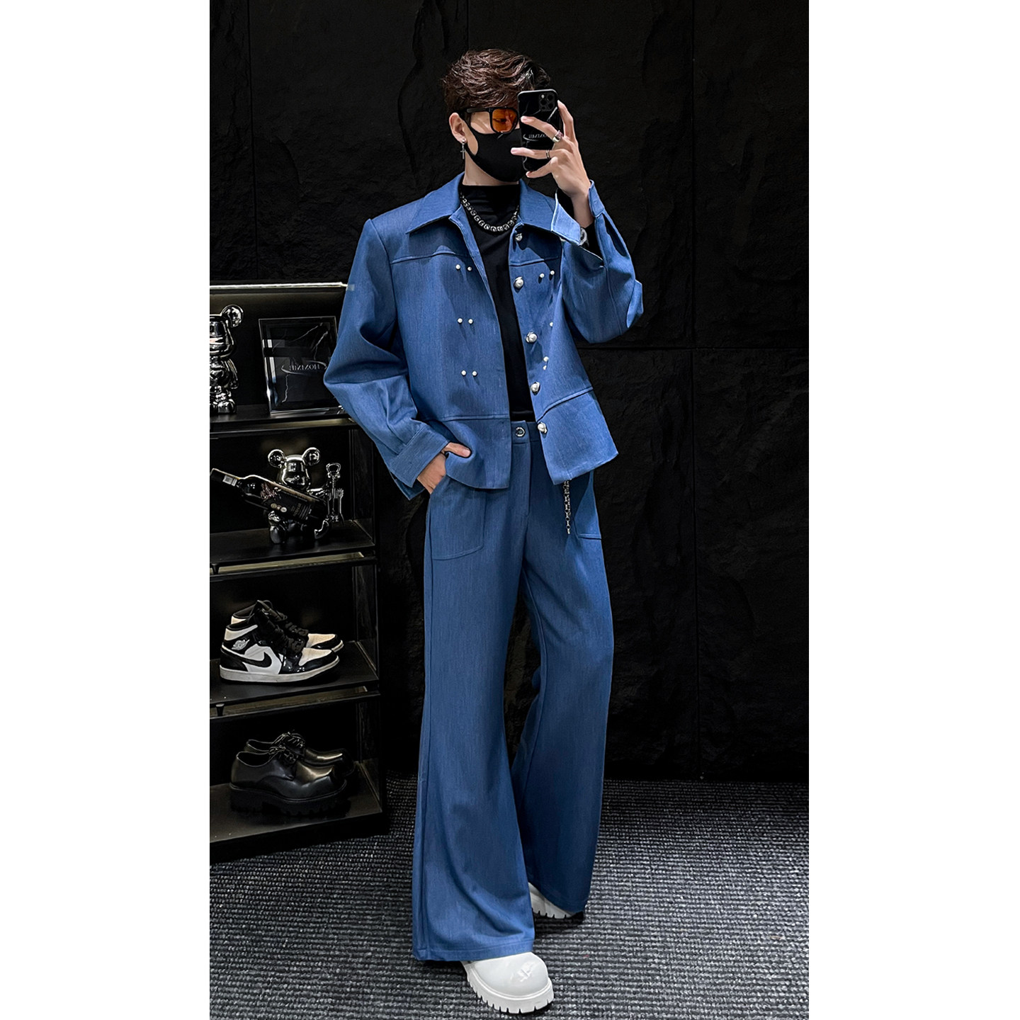 Limitless HOMME Korean New Pearl Cropped Jacket Set Men's Loose Silhouette Flared Pants Two-Piece Set