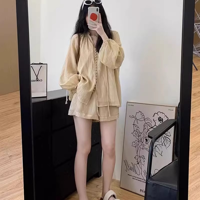 Extra large size 300 pounds new Chinese puff sleeve V-neck long sleeve shirt summer breathable sunscreen jacket shorts two-piece set