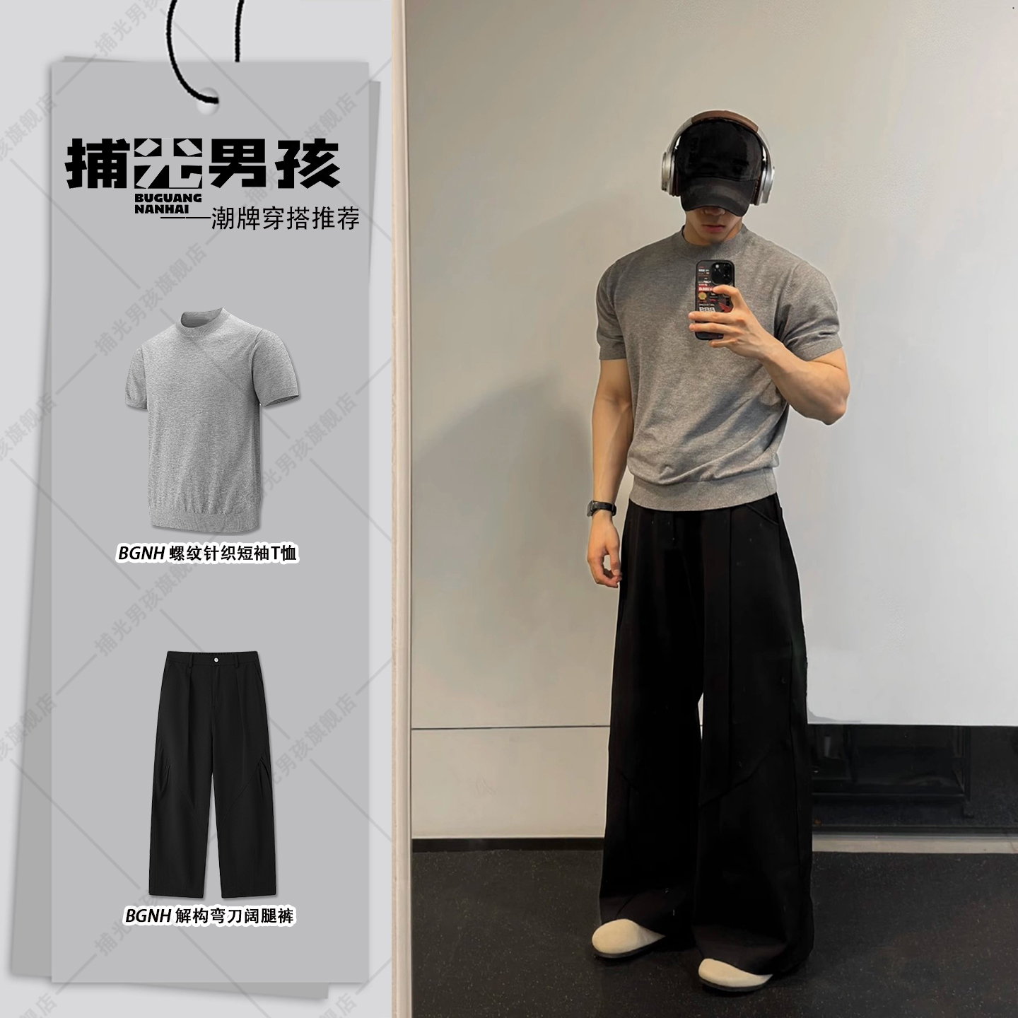 American boxy fit knitted short-sleeved T-shirt deconstructed scimitar wide-leg pants boys' cool and handsome outfit summer