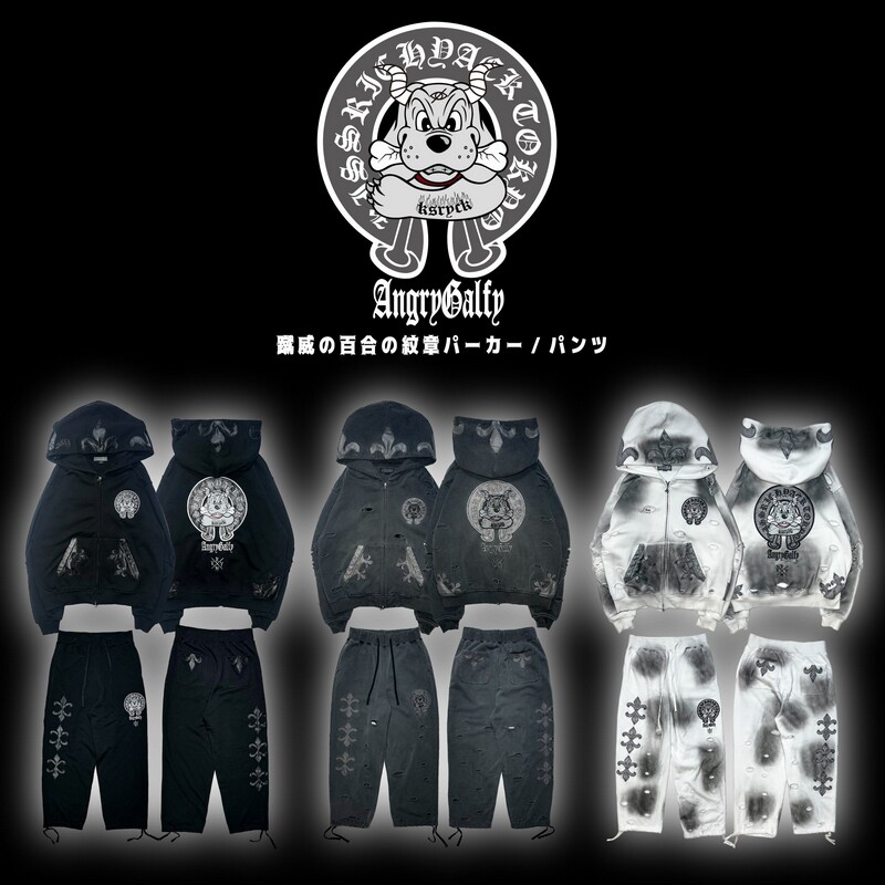Japanese Harajuku trendy brand GALLY co-branded KRY rivet leather patchwork washed lily crest sweatshirt trousers jacket men