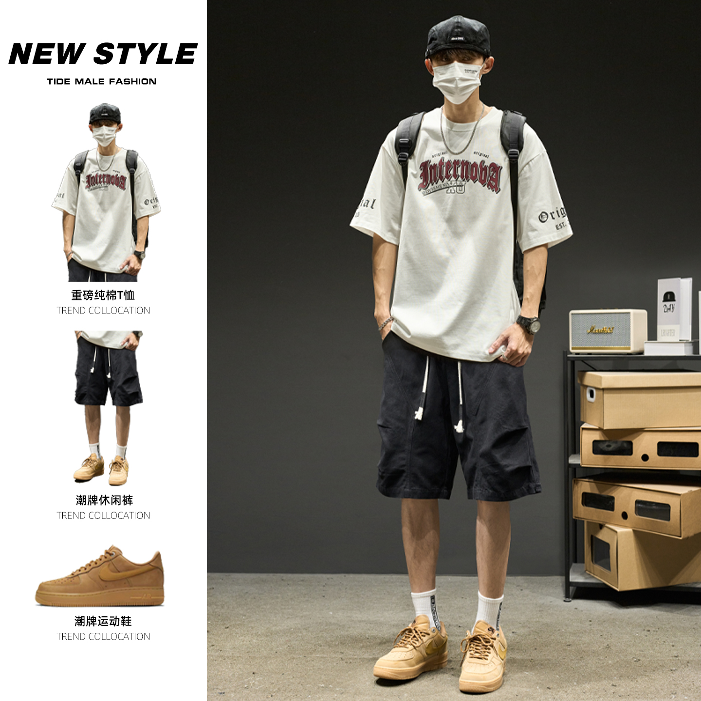 Cool and handsome outfit for boys, summer American short-sleeved T-shirt with cargo shorts, a set of new ruffian men's clothing