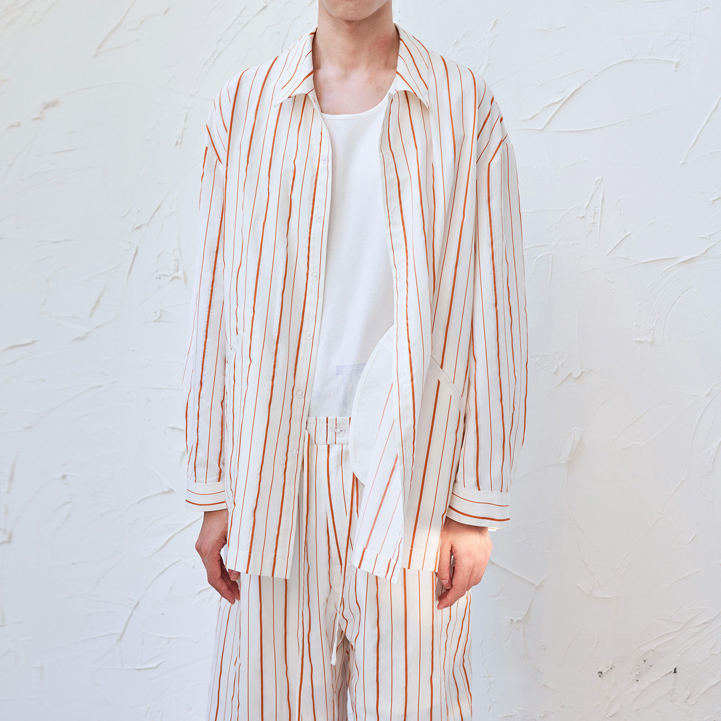 Light yarn weave loose high-end vertical stripe suit men's long sleeve shirt drawstring wide-leg trousers casual lazy style